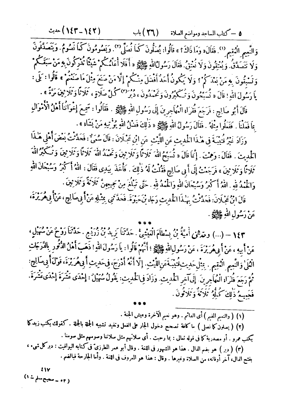143 - (595) وَحَدَّثَنِي أُمَيَّةُ بْنُ بِسْطَامَ الْعَيْشِيُّ، حَدَّثَنَا يَزِيدُ بْنُ زُرَيْعٍ، حَدَّثَنَا رَوْحٌ، عَنْ سُهَيْلٍ، عَنْ أَبِيهِ، عَنْ أَبِي هُرَيْرَةَ، عَنْ رَسُولِ اللهِ صَلَّى اللهُ عَلَيْهِ وَسَلَّمَ أَنَّهُمْ قَالُوا: يَا رَسُولَ اللهِ ذَهَبَ أَهْلُ الدُّثُورِ بِالدَّرَجَاتِ الْعُلَى، وَالنَّعِيمِ الْمُقِيمِ، بِمِثْلِ حَدِيثِ قُتَيْبَةَ، عَنِ اللَّيْثِ إِلَّا أَنَّهُ أَدْرَجَ فِي حَدِيثِ أَبِي هُرَيْرَةَ قَوْلَ أَبِي صَالِحٍ، ثُمَّ رَجَعَ فُقَرَاءُ الْمُهَاجِرِينَ إِلَى آخِرِ الْحَدِيثِ، وَزَادَ فِي الْحَدِيثِ: يَقُولُ سُهَيْلٌ: إِحْدَى عَشْرَةَ، إِحْدَى عَشْرَةَ، فَجَمِيعُ ذَلِكَ كُلِّهِ ثَلَاثَةٌ وَثَلَاثُونَ