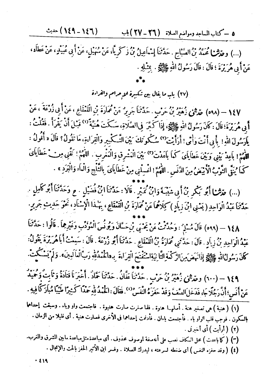 147 - (598) حَدَّثَنِي زُهَيْرُ بْنُ حَرْبٍ، حَدَّثَنَا جَرِيرٌ، عَنْ عُمَارَةَ بْنِ الْقَعْقَاعِ، عَنْ أَبِي زُرْعَةَ، عَنْ أَبِي هُرَيْرَةَ، قَالَ: كَانَ رَسُولُ اللهِ صَلَّى اللهُ عَلَيْهِ وَسَلَّمَ، إِذَا كَبَّرَ فِي الصَّلَاةِ، سَكَتَ هُنَيَّةً قَبْلَ أَنْ يَقْرَأَ، فَقُلْتُ: يَا رَسُولَ اللهِ بِأَبِي أَنْتَ وَأُمِّي أَرَأَيْتَ سُكُوتَكَ بَيْنَ التَّكْبِيرِ وَالْقِرَاءَةِ، مَا تَقُولُ؟ قَالَ " أَقُولُ: §اللهُمَّ بَاعِدْ بَيْنِي وَبَيْنَ خَطَايَايَ كَمَا بَاعَدْتَ بَيْنَ الْمَشْرِقِ وَالْمَغْرِبِ، اللهُمَّ نَقِّنِي مِنْ خَطَايَايَ كَمَا يُنَقَّى الثَّوْبُ الْأَبْيَضُ مِنَ الدَّنَسِ، اللهُمَّ اغْسِلْنِي مِنْ خَطَايَايَ بِالثَّلْجِ وَالْمَاءِ وَالْبَرَدِ "