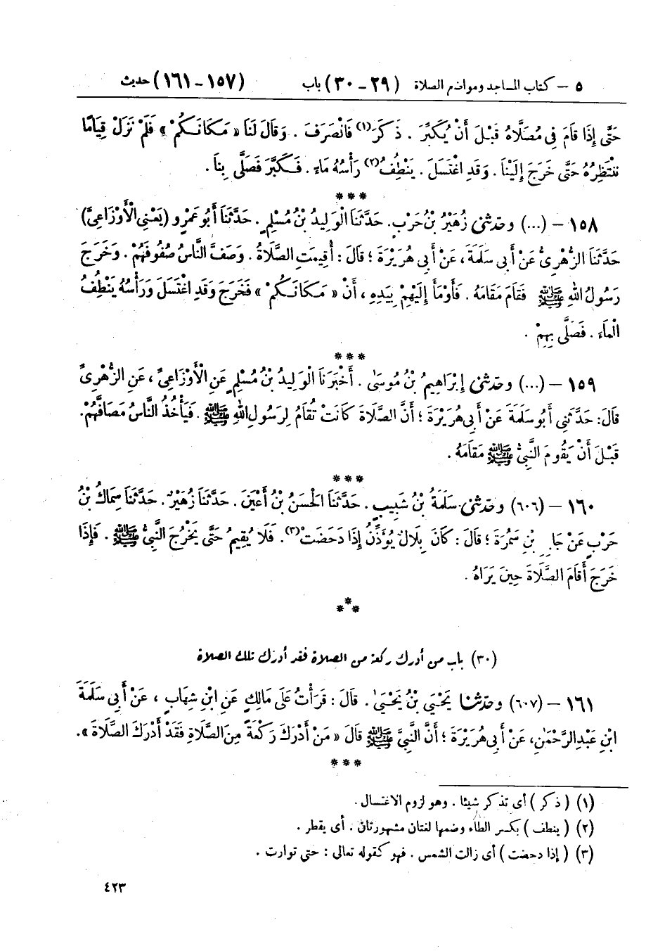 158 - (605) وَحَدَّثَنِي زُهَيْرُ بْنُ حَرْبٍ، حَدَّثَنَا الْوَلِيدُ بْنُ مُسْلِمٍ، حَدَّثَنَا أَبُو عَمْرٍو يَعْنِي الْأَوْزَاعِيَّ، حَدَّثَنَا الزُّهْرِيُّ، عَنْ أَبِي سَلَمَةَ، عَنْ أَبِي هُرَيْرَةَ، قَالَ: «§أُقِيمَتِ الصَّلَاةُ، وَصَفَّ النَّاسُ صُفُوفَهُمْ، وَخَرَجَ رَسُولُ اللهِ صَلَّى اللهُ عَلَيْهِ وَسَلَّمَ، فَقَامَ مَقَامَهُ، فَأَوْمَأَ إِلَيْهِمْ بِيَدِهِ أَنْ مَكَانَكُمْ، فَخَرَجَ وَقَدِ اغْتَسَلَ وَرَأْسُهُ يَنْطُفُ الْمَاءَ، فَصَلَّى بِهِمْ»