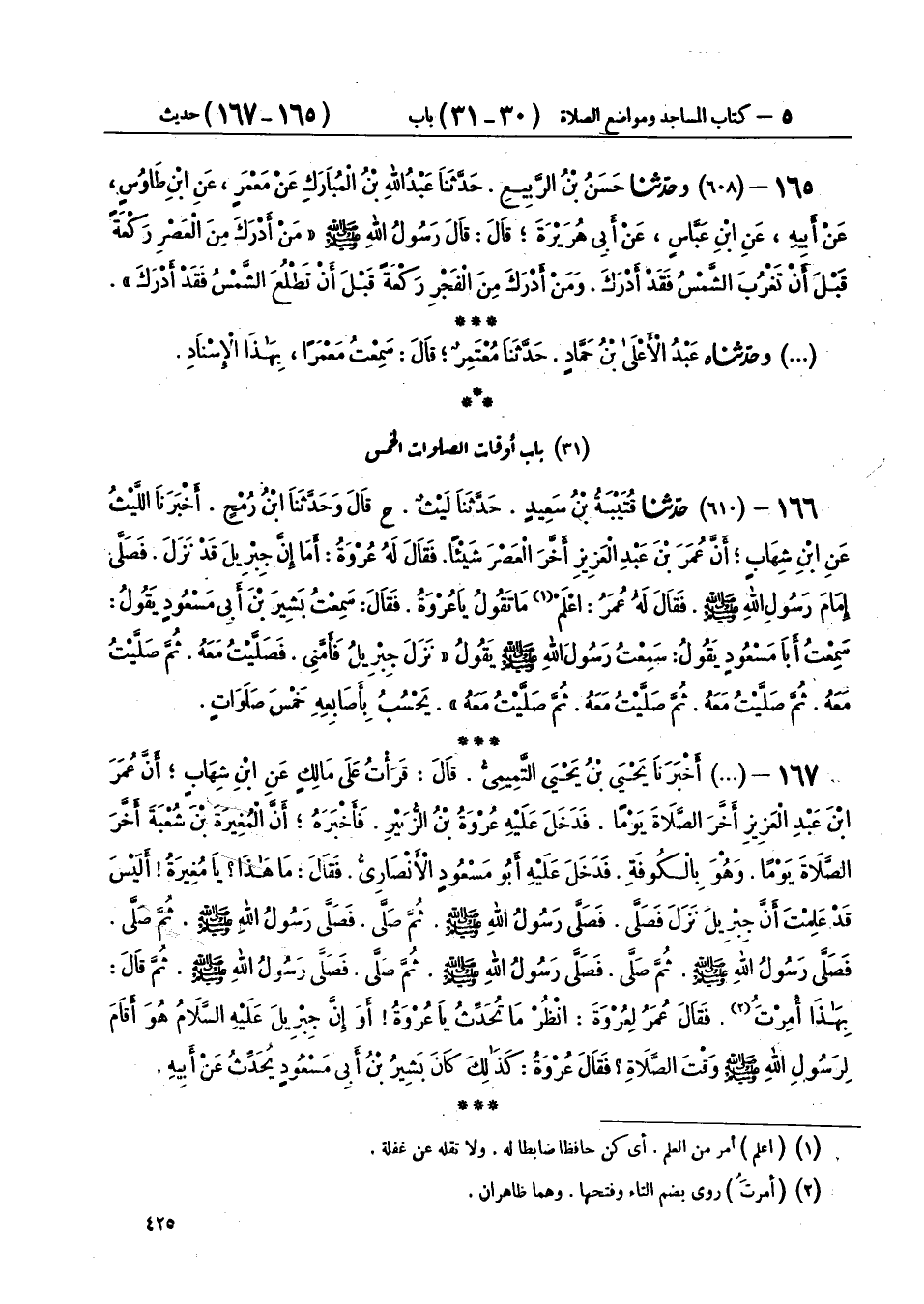 167 - (610) أَخْبَرَنَا يَحْيَى بْنُ يَحْيَى التَّمِيمِيُّ، قَالَ: قَرَأْتُ عَلَى مَالِكٍ، عَنِ ابْنِ شِهَابٍ، أَنَّ عُمَرَ بْنَ عَبْدِ الْعَزِيزِ، أَخَّرَ الصَّلَاةَ يَوْمًا، فَدَخَلَ عَلَيْهِ عُرْوَةُ بْنُ الزُّبَيْرِ، فَأَخْبَرَهُ أَنَّ الْمُغِيرَةَ بْنَ شُعْبَةَ أَخَّرَ الصَّلَاةَ يَوْمًا وَهُوَ بِالْكُوفَةِ، فَدَخَلَ عَلَيْهِ أَبُو مَسْعُودٍ الْأَنْصَارِيُّ، فَقَالَ: مَا هَذَا؟ يَا مُغِيرَةُ أَلَيْسَ قَدْ عَلِمْتَ §أَنَّ جِبْرِيلَ نَزَلَ فَصَلَّى، فَصَلَّى رَسُولُ اللهِ صَلَّى اللهُ عَلَيْهِ وَسَلَّمَ، ثُمَّ صَلَّى، فَصَلَّى رَسُولُ اللهِ صَلَّى اللهُ عَلَيْهِ وَسَلَّمَ، ثُمَّ صَلَّى، فَصَلَّى رَسُولُ اللهِ صَلَّى اللهُ عَلَيْهِ وَسَلَّمَ، ثُمَّ صَلَّى، فَصَلَّى رَسُولُ اللهِ صَلَّى اللهُ عَلَيْهِ وَسَلَّمَ، ثُمَّ صَلَّى، فَصَلَّى رَسُولُ اللهِ صَلَّى اللهُ عَلَيْهِ وَسَلَّمَ، ثُمَّ قَالَ: «بِهَذَا أُمِرْتُ» فَقَالَ عُمَرُ لِعُرْوَةَ: انْظُرْ مَا تُحَدِّثُ يَا عُرْوَةُ، أَوَ إِنَّ جِبْرِيلَ عَلَيْهِ السَّلَامُ هُوَ أَقَامَ لِرَسُولِ اللهِ صَلَّى اللهُ عَلَيْهِ وَسَلَّمَ وَقْتَ الصَّلَاةِ، فَقَالَ عُرْوَةُ: كَذَلِكَ كَانَ بَشِيرُ بْنُ أَبِي مَسْعُودٍ، يُحَدِّثُ عَنْ أَبِيهِ.