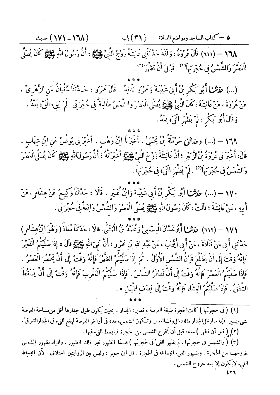 168 - (611) قَالَ عُرْوَةُ، وَلَقَدْ حَدَّثَتْنِي عَائِشَةُ زَوْجُ النَّبِيِّ صَلَّى اللهُ عَلَيْهِ وَسَلَّمَ: «أَنَّ رَسُولَ اللهِ صَلَّى اللهُ عَلَيْهِ وَسَلَّمَ كَانَ يُصَلِّ الْعَصْرَ وَالشَّمْسُ فِي حُجْرَتِهَا، قَبْلَ أَنْ تَظْهَرَ»