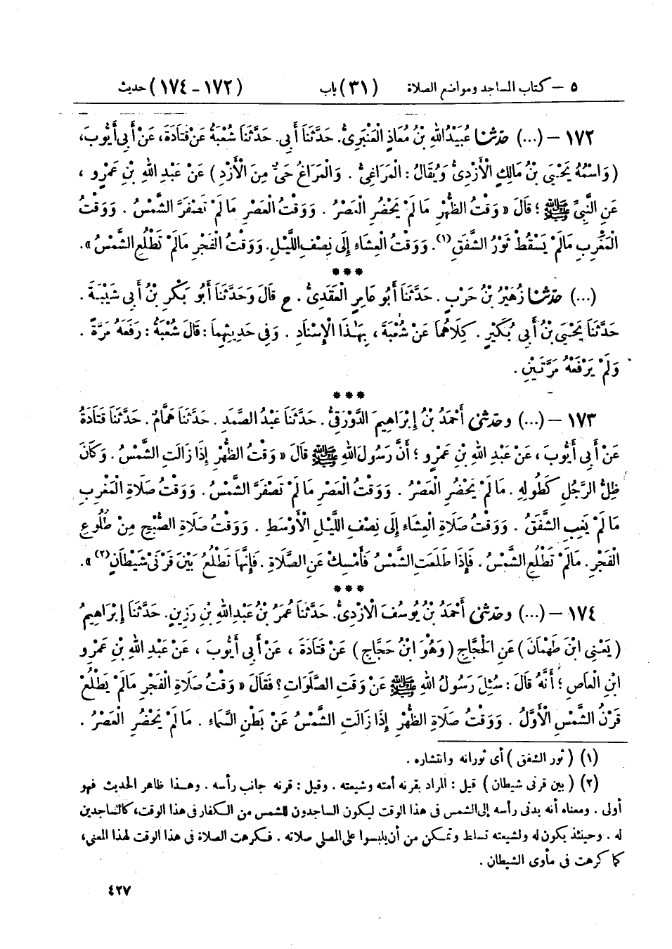 173 - (612) وَحَدَّثَنِي أَحْمَدُ بْنُ إِبْرَاهِيمَ الدَّوْرَقِيُّ، حَدَّثَنَا عَبْدُ الصَّمَدِ، حَدَّثَنَا هَمَّامٌ، حَدَّثَنَا قَتَادَةُ، عَنْ أَبِي أَيُّوبَ، عَنْ عَبْدِ اللهِ بْنِ عَمْرٍو، أَنَّ رَسُولَ اللهِ صَلَّى اللهُ عَلَيْهِ وَسَلَّمَ، قَالَ: «§وَقْتُ الظُّهْرِ إِذَا زَالَتِ الشَّمْسُ وَكَانَ ظِلُّ الرَّجُلِ كَطُولِهِ، مَا لَمْ يَحْضُرِ الْعَصْرُ، وَوَقْتُ الْعَصْرِ مَا لَمْ تَصْفَرَّ الشَّمْسُ، وَوَقْتُ صَلَاةِ الْمَغْرِبِ مَا لَمْ يَغِبِ الشَّفَقُ، وَوَقْتُ صَلَاةِ الْعِشَاءِ إِلَى نِصْفِ اللَّيْلِ الْأَوْسَطِ، وَوَقْتُ صَلَاةِ الصُّبْحِ مِنْ طُلُوعِ الْفَجْرِ مَا لَمْ تَطْلُعِ الشَّمْسُ، فَإِذَا طَلَعَتِ الشَّمْسُ فَأَمْسِكْ عَنِ الصَّلَاةِ، فَإِنَّهَا تَطْلُعْ بَيْنَ قَرْنَيْ شَيْطَانٍ»
