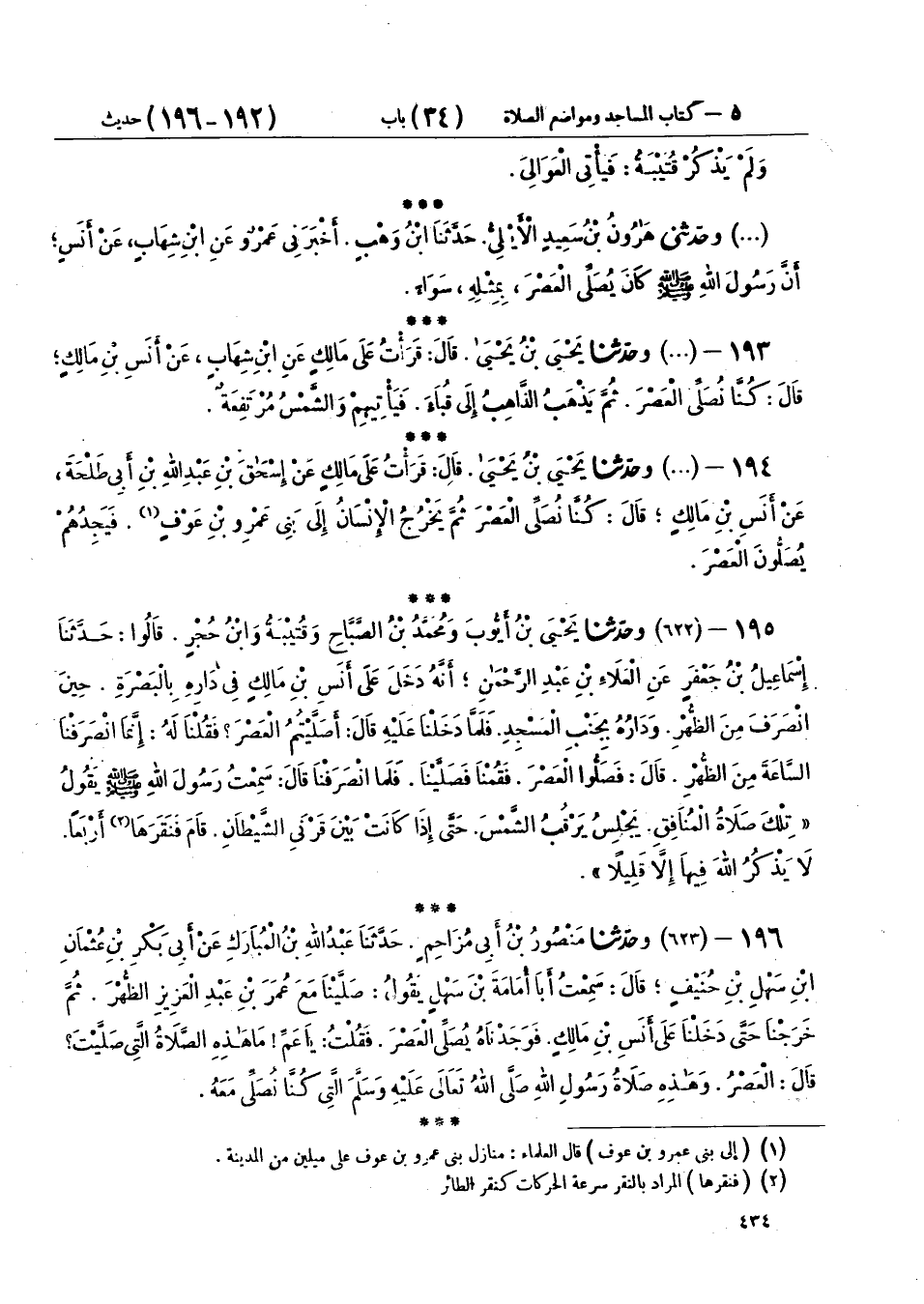 194 - (621) وَحَدَّثَنَا يَحْيَى بْنُ يَحْيَى، قَالَ: قَرَأْتُ عَلَى مَالِكٍ، عَنْ إِسْحَاقَ بْنِ عَبْدِ اللهِ بْنِ أَبِي طَلْحَةَ، عَنْ أَنَسِ بْنِ مَالِكٍ، قَالَ: «§كُنَّا نُصَلِّي الْعَصْرَ، ثُمَّ يَخْرُجُ الْإِنْسَانُ إِلَى بَنِي عَمْرِو بْنِ عَوْفٍ، فَيَجِدُهُمْ يُصَلُّونَ الْعَصْرَ»