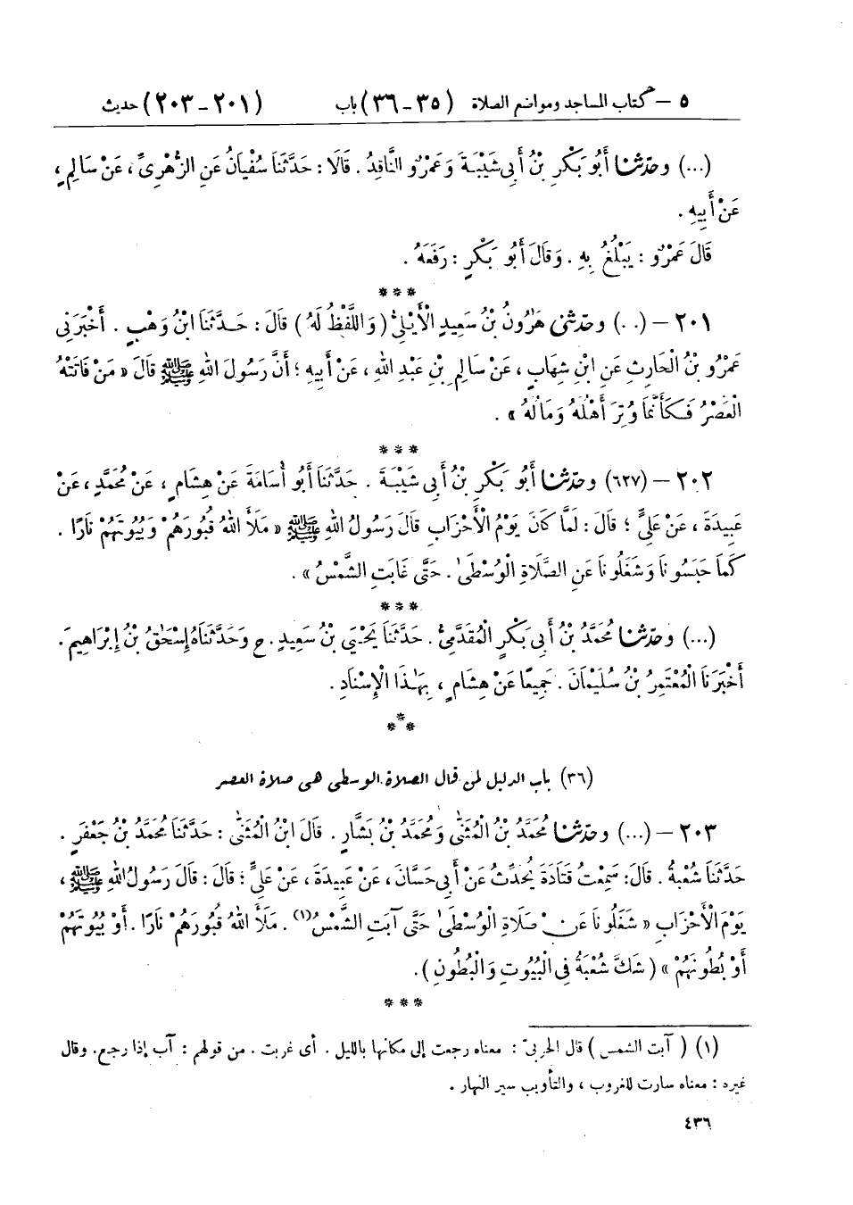202 - (627) وَحَدَّثَنَا أَبُو بَكْرِ بْنُ أَبِي شَيْبَةَ، حَدَّثَنَا أَبُو أُسَامَةَ، عَنْ هِشَامٍ، عَنْ مُحَمَّدٍ، عَنْ عَبِيدَةَ، عَنْ عَلِيٍّ، قَالَ: لَمَّا كَانَ يَوْمُ الْأَحْزَابِ، قَالَ رَسُولُ اللهِ صَلَّى اللهُ عَلَيْهِ وَسَلَّمَ: «§مَلَأَ اللهُ قُبُورَهُمْ وَبُيُوتَهُمْ نَارًا، كَمَا حَبَسُونَا، وَشَغَلُونَا عَنِ الصَّلَاةِ الْوُسْطَى، حَتَّى غَابَتِ الشَّمْسُ»