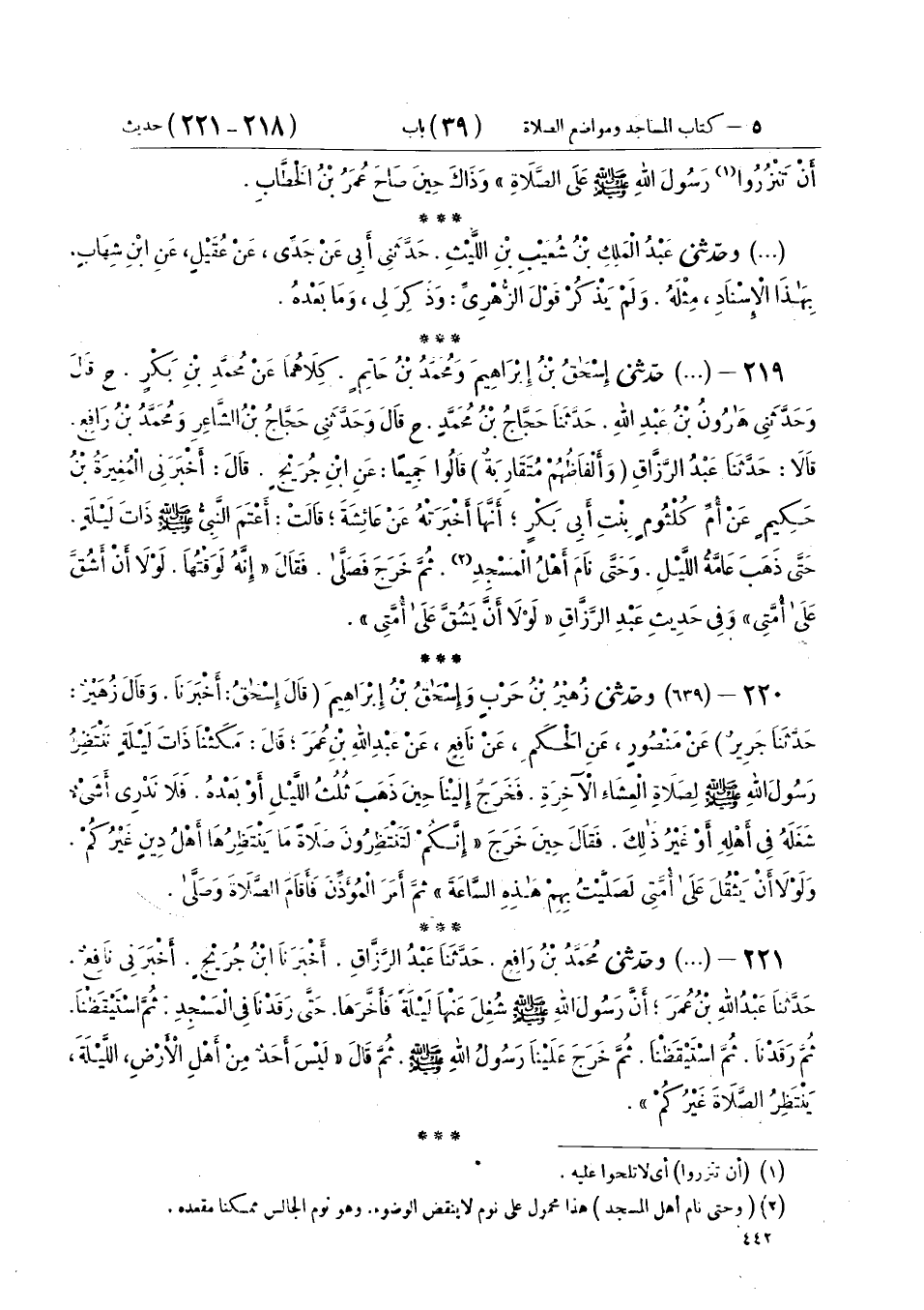 219 - (638) حَدَّثَنِي إِسْحَاقُ بْنُ إِبْرَاهِيمَ، وَمُحَمَّدُ بْنُ حَاتِمٍ، كِلَاهُمَا عَنْ مُحَمَّدِ بْنِ بَكْرٍ، ح قَالَ: وَحَدَّثَنِي هَارُونُ بْنُ عَبْدِ اللهِ، حَدَّثَنَا حَجَّاجُ بْنُ مُحَمَّدٍ، ح قَالَ: وَحَدَّثَنِي حَجَّاجُ بْنُ الشَّاعِرِ، وَمُحَمَّدُ بْنُ رَافِعٍ، قَالَا: حَدَّثَنَا عَبْدُ الرَّزَّاقِ، وَأَلْفَاظُهُمْ مُتَقَارِبَةٌ، قَالُوا جَمِيعًا: عَنِ ابْنِ جُرَيْجٍ، قَالَ: أَخْبَرَنِي الْمُغِيرَةُ بْنُ حَكِيمٍ، عَنْ أُمِّ كُلْثُومٍ بِنْتِ أَبِي بَكْرٍ، أَنَّهَا أَخْبَرَتْهُ عَنْ عَائِشَةَ، قَالَتْ: أَعْتَمَ النَّبِيُّ صَلَّى اللهُ عَلَيْهِ وَسَلَّمَ ذَاتَ لَيْلَةٍ حَتَّى ذَهَبَ عَامَّةُ اللَّيْلِ، وَحَتَّى نَامَ أَهْلُ الْمَسْجِدِ، ثُمَّ خَرَجَ فَصَلَّى، فَقَالَ: «§إِنَّهُ لَوَقْتُهَا لَوْلَا أَنْ أَشُقَّ عَلَى أُمَّتِي» وَفِي حَدِيثِ عَبْدِ الرَّزَّاقِ: «لَوْلَا أَنْ يَشُقَّ عَلَى أُمَّتِي»