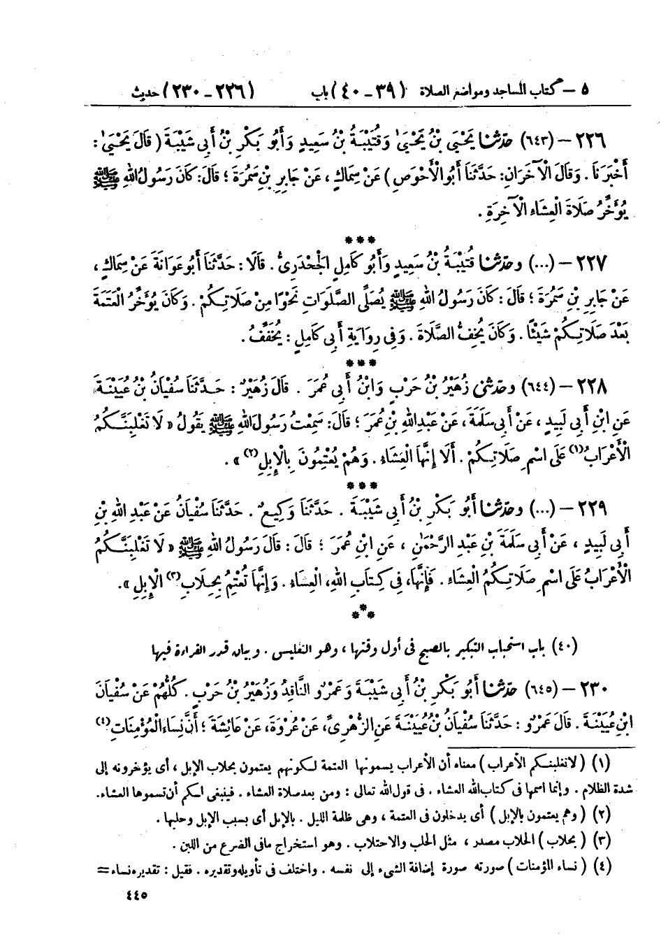 226 - (643) حَدَّثَنَا يَحْيَى بْنُ يَحْيَى، وَقُتَيْبَةُ بْنُ سَعِيدٍ، وَأَبُو بَكْرِ بْنُ أَبِي شَيْبَةَ، قَالَ يَحْيَى: أَخْبَرَنَا، وَقَالَ الْآخَرَانِ: حَدَّثَنَا أَبُو الْأَحْوَصِ، عَنْ سِمَاكٍ، عَنْ جَابِرِ بْنِ سَمُرَةَ، قَالَ: «كَانَ رَسُولُ اللهِ صَلَّى اللهُ عَلَيْهِ وَسَلَّمَ §يُؤَخِّرُ صَلَاةَ الْعِشَاءِ الْآخِرَةِ»