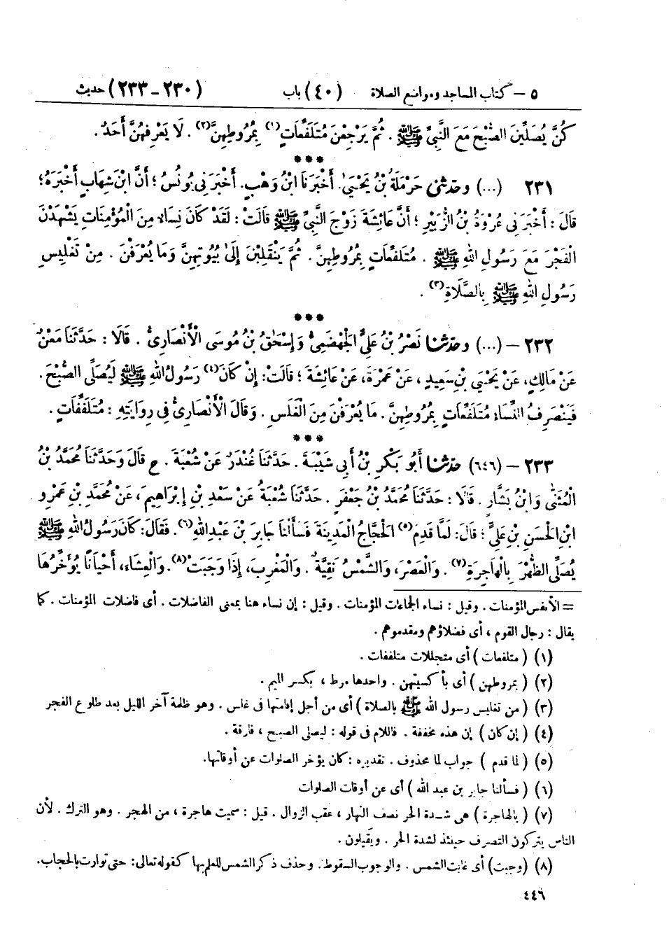 232 - (645) وَحَدَّثَنَا نَصْرُ بْنُ عَلِيٍّ الْجَهْضَمِيُّ، وَإِسْحَاقُ بْنُ مُوسَى الْأَنْصَارِيُّ، قَالَا: حَدَّثَنَا مَعْنٌ، عَنْ مَالِكٍ، عَنْ يَحْيَى بْنِ سَعِيدٍ، عَنْ عَمْرَةَ، عَنْ عَائِشَةَ، قَالَتْ: «إِنْ كَانَ رَسُولُ اللهِ صَلَّى اللهُ عَلَيْهِ وَسَلَّمَ §لَيُصَلِّي الصُّبْحَ، فَيَنْصَرِفُ النِّسَاءُ مُتَلَفِّعَاتٍ بِمُرُوطِهِنَّ، مَا يُعْرَفْنَ مِنَ الْغَلَسِ» وقَالَ الْأَنْصَارِيُّ فِي رِوَايَتِهِ: مُتَلَفِّفَاتٍ