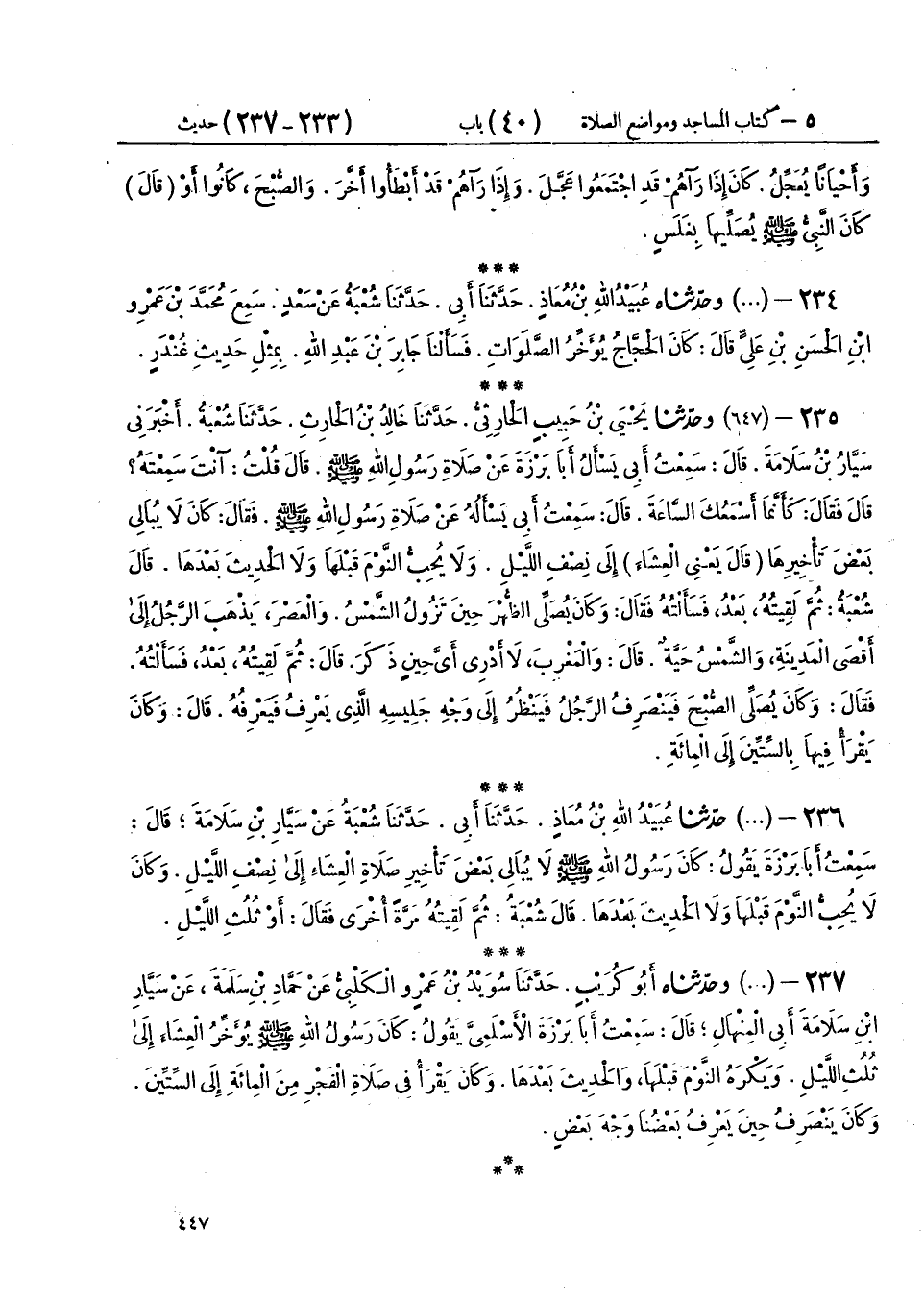 235 - (647) وَحَدَّثَنَا يَحْيَى بْنُ حَبِيبٍ الْحَارِثِيُّ، حَدَّثَنَا خَالِدُ بْنُ الْحَارِثِ، حَدَّثَنَا شُعْبَةُ، أَخْبَرَنِي سَيَّارُ بْنُ سَلَامَةَ، قَالَ: سَمِعْتُ أَبِي، يَسْأَلُ أَبَا بَرْزَةَ، عَنْ صَلَاةِ رَسُولِ اللهِ صَلَّى اللهُ عَلَيْهِ وَسَلَّمَ، قَالَ: قُلْتُ: آنْتَ سَمِعْتَهُ؟ قَالَ: فَقَالَ: كَأَنَّمَا أَسْمَعُكَ السَّاعَةَ، قَالَ: سَمِعْتُ أَبِي يَسْأَلُهُ عَنْ صَلَاةِ رَسُولِ اللهِ صَلَّى اللهُ عَلَيْهِ وَسَلَّمَ، فَقَالَ: " كَانَ §لَا يُبَالِي بَعْضَ تَأْخِيرِهَا - قَالَ: يَعْنِي الْعِشَاءَ - إِلَى نِصْفِ اللَّيْلِ، وَلَا يُحِبُّ النَّوْمَ قَبْلَهَا، وَلَا الْحَدِيثَ بَعْدَهَا "، قَالَ شُعْبَةُ: ثُمَّ لَقِيتُهُ بَعْدُ فَسَأَلْتُهُ، فَقَالَ: «وَكَانَ يُصَلِّي الظُّهْرَ حِينَ تَزُولُ الشَّمْسُ، وَالْعَصْرَ يَذْهَبُ الرَّجُلُ إِلَى أَقْصَى الْمَدِينَةِ وَالشَّمْسُ حَيَّةٌ»، قَالَ: وَالْمَغْرِبَ لَا أَدْرِي أَيَّ حِينٍ ذَكَرَ، قَالَ: ثُمَّ لَقِيتُهُ بَعْدُ فَسَأَلْتُهُ، فَقَالَ: «وَكَانَ يُصَلِّي الصُّبْحَ فَيَنْصَرِفُ الرَّجُلُ فَيَنْظُرُ إِلَى وَجْهِ جَلِيسِهِ الَّذِي يَعْرِفُ فَيَعْرِفُهُ»، قَالَ: «وَكَانَ يَقْرَأُ فِيهَا بِالسِّتِّينَ إِلَى الْمِائَةِ»