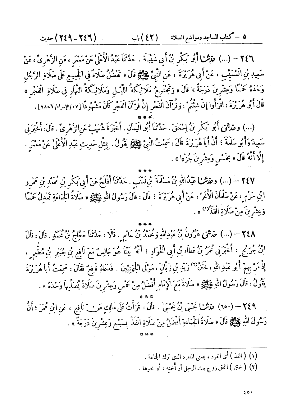 248 - (649) حَدَّثَنِي هَارُونُ بْنُ عَبْدِ اللهِ، وَمُحَمَّدُ بْنُ حَاتِمٍ، قَالَا: حَدَّثَنَا حَجَّاجُ بْنُ مُحَمَّدٍ، قَالَ: قَالَ ابْنُ جُرَيْجٍ: أَخْبَرَنِي عُمَرُ بْنُ عَطَاءِ بْنِ أَبِي الْخُوَارِ أَنَّهُ بَيْنَا هُوَ جَالِسٌ مَعَ نَافِعِ بْنِ جُبَيْرِ بْنِ مُطْعِمٍ إِذْ مَرَّ بِهِمْ أَبُو عَبْدِ اللهِ خَتَنُ زَيْدِ بْنِ زَبَّانَ، مَوْلَى الْجُهَنِيِّينَ، فَدَعَاهُ نَافِعٌ، فَقَالَ: سَمِعْتُ أَبَا هُرَيْرَةَ، يَقُولُ: قَالَ رَسُولُ اللهِ صَلَّى اللهُ عَلَيْهِ وَسَلَّمَ: «§صَلَاةٌ مَعَ الْإِمَامِ أَفْضَلُ مِنْ خَمْسٍ وَعِشْرِينَ صَلَاةً يُصَلِّيهَا وَحْدَهُ»