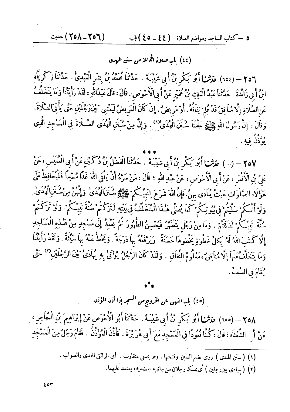 257 - (654) حَدَّثَنَا أَبُو بَكْرِ بْنُ أَبِي شَيْبَةَ، حَدَّثَنَا الْفَضْلُ بْنُ دُكَيْنٍ، عَنْ أَبِي الْعُمَيْسِ، عَنْ عَلِيِّ بْنِ الْأَقْمَرِ، عَنْ أَبِي الْأَحْوَصِ، عَنْ عَبْدِ اللهِ، قَالَ: «مَنْ سَرَّهُ أَنْ يَلْقَى اللهَ غَدًا مُسْلِمًا، فَلْيُحَافِظْ عَلَى هَؤُلَاءِ الصَّلَوَاتِ حَيْثُ يُنَادَى بِهِنَّ، فَإِنَّ §اللهَ شَرَعَ لِنَبِيِّكُمْ صَلَّى اللهُ عَلَيْهِ وَسَلَّمَ سُنَنَ الْهُدَى، وَإِنَّهُنَّ مَنْ سُنَنَ الْهُدَى، وَلَوْ أَنَّكُمْ صَلَّيْتُمْ فِي بُيُوتِكُمْ كَمَا يُصَلِّي هَذَا الْمُتَخَلِّفُ فِي بَيْتِهِ، لَتَرَكْتُمْ سُنَّةَ نَبِيِّكُمْ، وَلَوْ تَرَكْتُمْ سُنَّةَ نَبِيِّكُمْ لَضَلَلْتُمْ، وَمَا مِنْ رَجُلٍ يَتَطَهَّرُ فَيُحْسِنُ الطُّهُورَ، ثُمَّ يَعْمِدُ إِلَى مَسْجِدٍ مِنْ هَذِهِ الْمَسَاجِدِ، إِلَّا كَتَبَ اللهُ لَهُ بِكُلِّ خَطْوَةٍ يَخْطُوهَا حَسَنَةً، وَيَرْفَعُهُ بِهَا دَرَجَةً، وَيَحُطُّ عَنْهُ بِهَا سَيِّئَةً، وَلَقَدْ رَأَيْتُنَا وَمَا يَتَخَلَّفُ عَنْهَا إِلَّا مُنَافِقٌ مَعْلُومُ النِّفَاقِ، وَلَقَدْ كَانَ الرَّجُلُ يُؤْتَى بِهِ يُهَادَى بَيْنَ الرَّجُلَيْنِ حَتَّى يُقَامَ فِي الصَّفِّ»