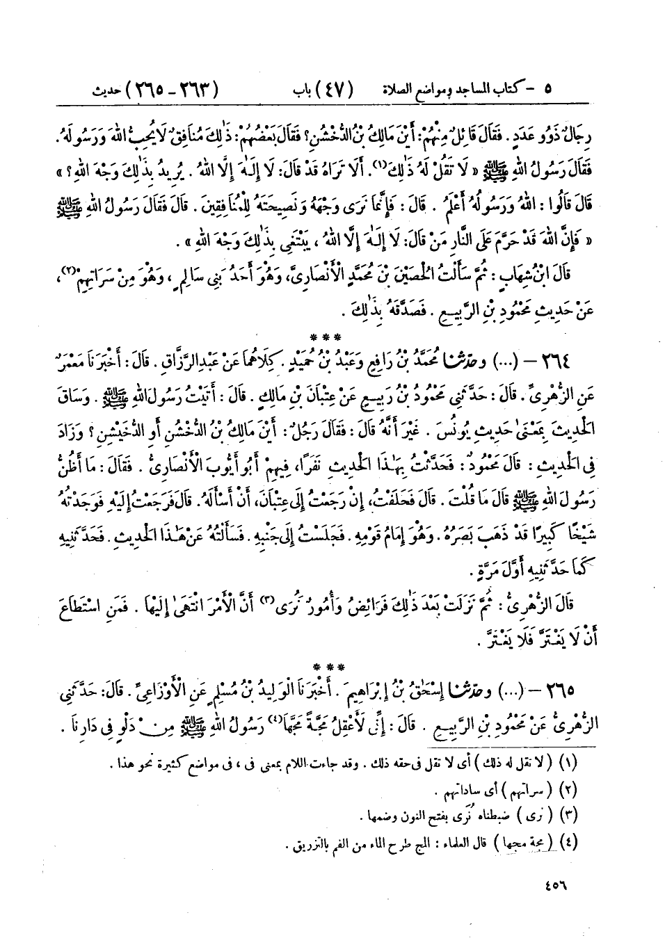 264 - (33) وَحَدَّثَنَا مُحَمَّدُ بْنُ رَافِعٍ، وَعَبْدُ بْنُ حُمَيْدٍ، كِلَاهُمَا عَنْ عَبْدِ الرَّزَّاقِ، قَالَ: أَخْبَرَنَا مَعْمَرٌ، عَنِ الزُّهْرِيِّ، قَالَ: حَدَّثَنِي مَحْمُودُ بْنُ رَبِيعٍ، عَنْ عِتْبَانَ بْنِ مَالِكٍ، قَالَ: أَتَيْتُ رَسُولَ اللهِ صَلَّى اللهُ عَلَيْهِ وَسَلَّمَ وَسَاقَ الْحَدِيثَ بِمَعْنَى حَدِيثِ يُونُسَ، غَيْرَ أَنَّهُ قَالَ: فَقَالَ رَجُلٌ أَيْنَ مَالِكُ بْنُ الدُّخْشُنِ أَوِ الدُّخَيْشِنِ، وَزَادَ فِي الْحَدِيثِ قَالَ مَحْمُودٌ: فَحَدَّثْتُ بِهَذَا الْحَدِيثِ نَفَرًا فِيهِمْ أَبُو أَيُّوبَ الْأَنْصَارِيُّ، فَقَالَ: مَا أَظُنُّ رَسُولَ اللهِ صَلَّى اللهُ عَلَيْهِ وَسَلَّمَ قَالَ مَا قُلْتَ، قَالَ: فَحَلَفْتُ إِنْ رَجَعْتُ إِلَى عِتْبَانَ أَنْ أَسْأَلَهُ، قَالَ: فَرَجَعْتُ إِلَيْهِ فَوَجَدْتُهُ شَيْخًا كَبِيرًا قَدْ ذَهَبَ بَصَرُهُ وَهُوَ إِمَامُ قَوْمِهِ، فَجَلَسْتُ إِلَى جَنْبِهِ، فَسَأَلْتُهُ عَنْ هَذَا الْحَدِيثِ، فَحَدَّثَنِيهِ كَمَا حَدَّثَنِيهِ أَوَّلَ مَرَّةٍ، قَالَ الزُّهْرِيُّ: «ثُمَّ نَزَلَتْ بَعْدَ ذَلِكَ فَرَائِضُ وَأُمُورٌ نَرَى أَنَّ الْأَمْرَ انْتَهَى إِلَيْهَا فَمَنِ اسْتَطَاعَ أَنْ لَا يَغْتَرَّ فَلَا يَغْتَرَّ»،