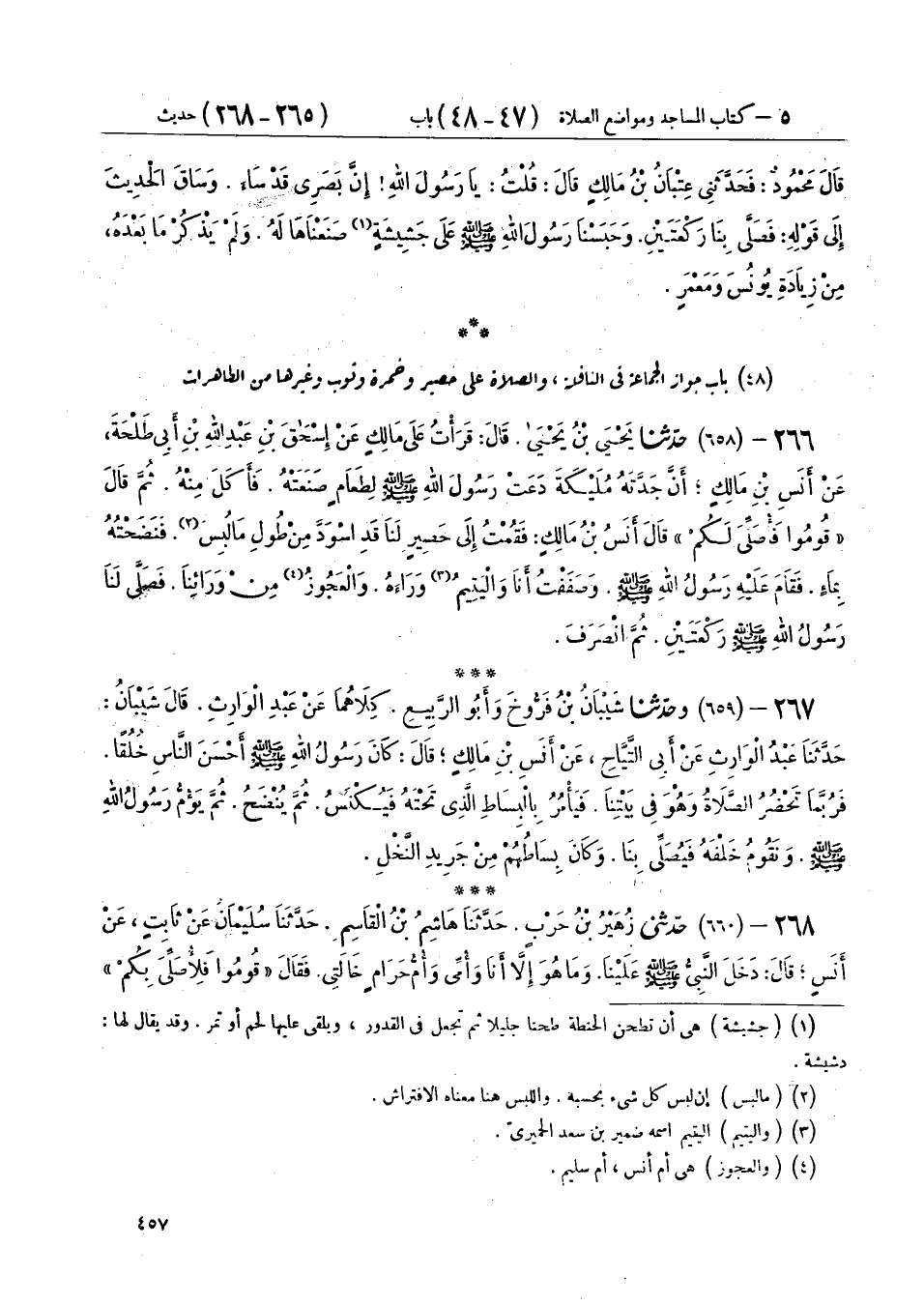 48 - بَابُ جَوَازِ الْجَمَاعَةِ فِي النَّافِلَةِ، وَالصَّلَاةِ عَلَى حَصِيرٍ وَخُمْرَةٍ وَثَوْبٍ، وَغَيْرِهَا مِنَ الطَّاهِرَاتِ