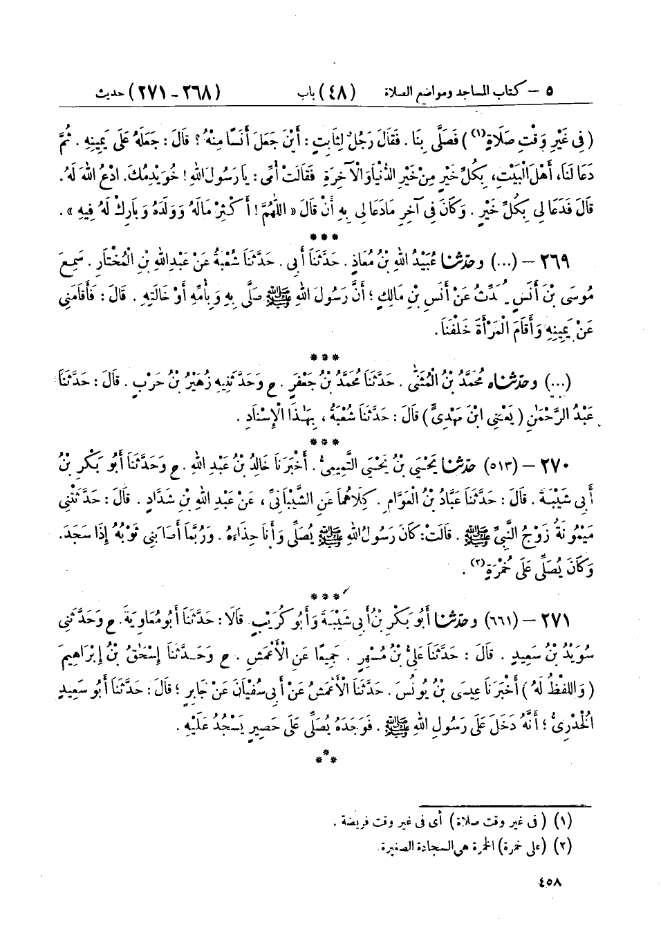 271 - (661) وَحَدَّثَنَا أَبُو بَكْرِ بْنُ أَبِي شَيْبَةَ، وَأَبُو كُرَيْبٍ، قَالَا: حَدَّثَنَا أَبُو مُعَاوِيَةَ، ح وَحَدَّثَنِي سُوَيْدُ بْنُ سَعِيدٍ، قَالَ: حَدَّثَنَا عَلِيُّ بْنُ مُسْهِرٍ، جَمِيعًا عَنِ الْأَعْمَشِ، ح وَحَدَّثَنَا إِسْحَاقُ بْنُ إِبْرَاهِيمَ، وَاللَّفْظُ لَهُ، أَخْبَرَنَا عِيسَى بْنُ يُونُسَ، حَدَّثَنَا الْأَعْمَشُ، عَنْ أَبِي سُفْيَانَ، عَنْ جَابِرٍ، قَالَ: حَدَّثَنَا أَبُو سَعِيدٍ الْخُدْرِيُّ، «أَنَّهُ دَخَلَ عَلَى رَسُولِ اللهِ صَلَّى اللهُ عَلَيْهِ وَسَلَّمَ، فَوَجَدَهُ §يُصَلِّي عَلَى حَصِيرٍ يَسْجُدُ عَلَيْهِ»