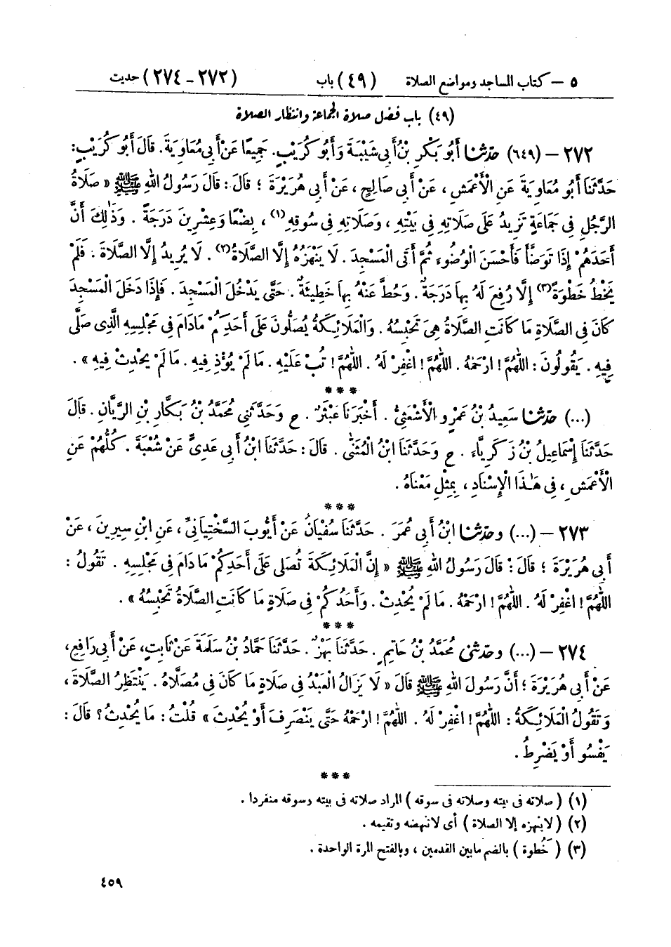 272 - (649) حَدَّثَنَا أَبُو بَكْرِ بْنُ أَبِي شَيْبَةَ، وَأَبُو كُرَيْبٍ، جَمِيعًا عَنْ أَبِي مُعَاوِيَةَ، قَالَ أَبُو كُرَيْبٍ: حَدَّثَنَا أَبُو مُعَاوِيَةَ، عَنِ الْأَعْمَشِ، عَنْ أَبِي صَالِحٍ، عَنْ أَبِي هُرَيْرَةَ، قَالَ: قَالَ رَسُولُ اللهِ صَلَّى اللهُ عَلَيْهِ وَسَلَّمَ: " §صَلَاةُ الرَّجُلِ فِي جَمَاعَةٍ تَزِيدُ عَلَى صَلَاتِهِ فِي بَيْتِهِ، وَصَلَاتِهِ فِي سُوقِهِ، بِضْعًا وَعِشْرِينَ دَرَجَةً، وَذَلِكَ أَنَّ أَحَدَهُمْ إِذَا تَوَضَّأَ فَأَحْسَنَ الْوُضُوءَ، ثُمَّ أَتَى الْمَسْجِدَ لَا يَنْهَزُهُ إِلَّا الصَّلَاةُ، لَا يُرِيدُ إِلَّا الصَّلَاةَ، فَلَمْ يَخْطُ خَطْوَةً إِلَّا رُفِعَ لَهُ بِهَا دَرَجَةٌ، وَحُطَّ عَنْهُ بِهَا خَطِيئَةٌ، حَتَّى يَدْخُلَ الْمَسْجِدَ، فَإِذَا دَخَلَ الْمَسْجِدَ كَانَ فِي الصَّلَاةِ مَا كَانَتِ الصَّلَاةُ هِيَ تَحْبِسُهُ، وَالْمَلَائِكَةُ يُصَلُّونَ عَلَى أَحَدِكُمْ مَا دَامَ فِي مَجْلِسِهِ الَّذِي صَلَّى فِيهِ، يَقُولُونَ: اللهُمَّ ارْحَمْهُ، اللهُمَّ اغْفِرْ لَهُ، اللهُمَّ تُبْ عَلَيْهِ، مَا لَمْ يُؤْذِ فِيهِ، مَا لَمْ يُحْدِثْ فِيهِ "