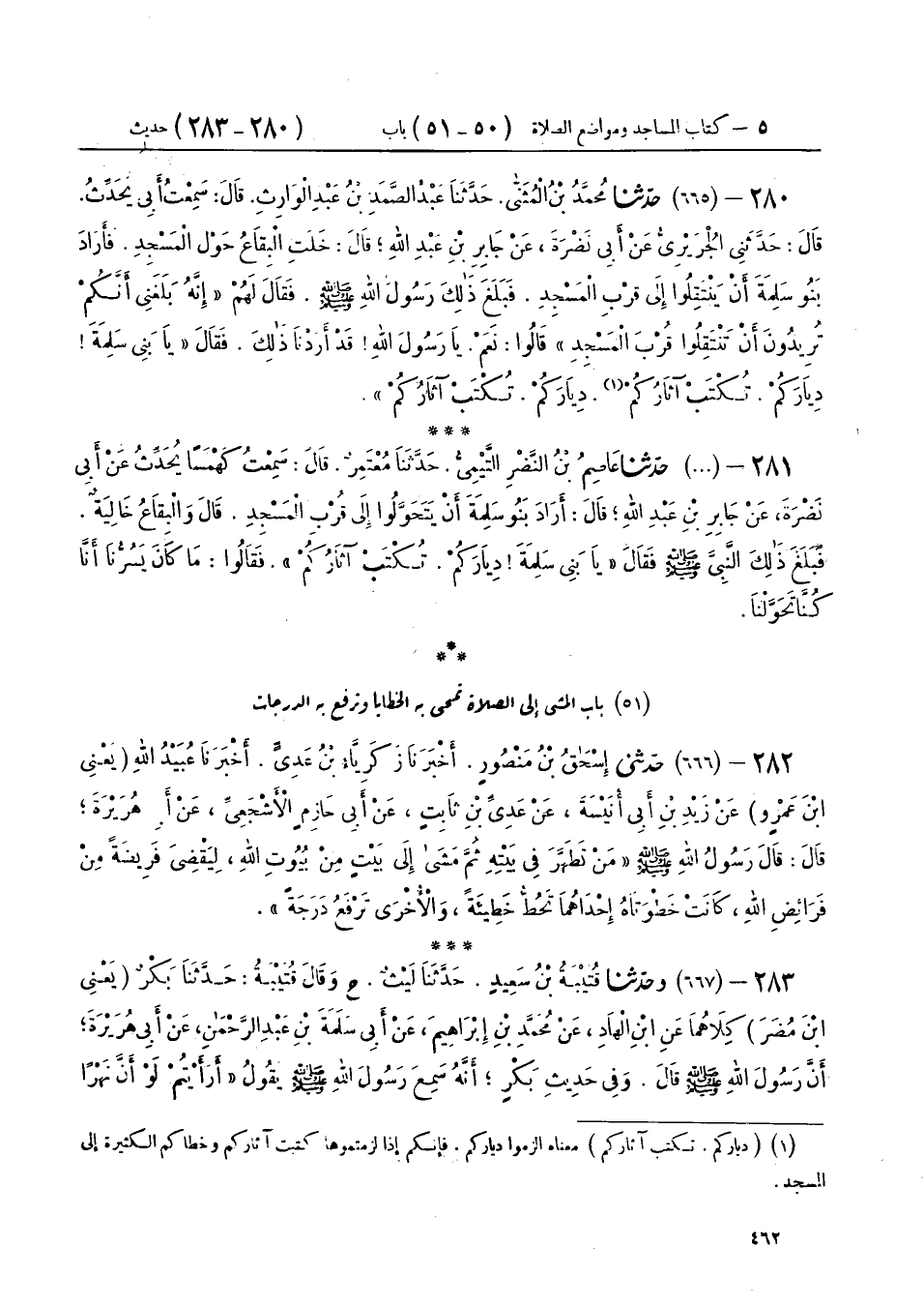 280 - (665) حَدَّثَنَا مُحَمَّدُ بْنُ الْمُثَنَّى، حَدَّثَنَا عَبْدُ الصَّمَدِ بْنُ عَبْدِ الْوَارِثِ، قَالَ: سَمِعْتُ أَبِي، يُحَدِّثُ، قَالَ: حَدَّثَنِي الْجُرَيْرِيُّ، عَنْ أَبِي نَضْرَةَ، عَنْ جَابِرِ بْنِ عَبْدِ اللهِ، قَالَ: خَلَتِ الْبِقَاعُ حَوْلَ الْمَسْجِدِ، فَأَرَادَ بَنُو سَلِمَةَ أَنْ يَنْتَقِلُوا إِلَى قُرْبِ الْمَسْجِدِ، فَبَلَغَ ذَلِكَ رَسُولَ اللهِ صَلَّى اللهُ عَلَيْهِ وَسَلَّمَ، فَقَالَ لَهُمْ: «إِنَّهُ بَلَغَنِي أَنَّكُمْ تُرِيدُونَ أَنْ تَنْتَقِلُوا قُرْبَ الْمَسْجِدِ»، قَالُوا: نَعَمْ، يَا رَسُولَ اللهِ قَدْ أَرَدْنَا ذَلِكَ، فَقَالَ: «يَا بَنِي سَلِِمَةَ §دِيَارَكُمْ تُكْتَبْ آثَارُكُمْ، دِيَارَكُمْ تُكْتَبْ آثَارُكُمْ»