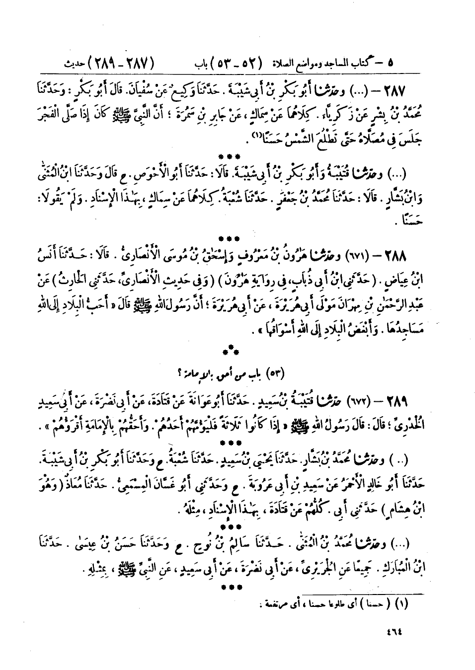 287 - (670) وَحَدَّثَنَا أَبُو بَكْرِ بْنُ أَبِي شَيْبَةَ، حَدَّثَنَا وَكِيعٌ، عَنْ سُفْيَانَ، قَالَ أَبُو بَكْرٍ: وَحَدَّثَنَا مُحَمَّدُ بْنُ بِشْرٍ، عَنْ زَكَرِيَّاءَ، كِلَاهُمَا عَنْ سِمَاكٍ، عَنْ جَابِرِ بْنِ سَمُرَةَ: «أَنَّ النَّبِيَّ صَلَّى اللهُ عَلَيْهِ وَسَلَّمَ كَانَ §إِذَا صَلَّى الْفَجْرَ جَلَسَ فِي مُصَلَّاهُ حَتَّى تَطْلُعَ الشَّمْسُ حَسَنًا»