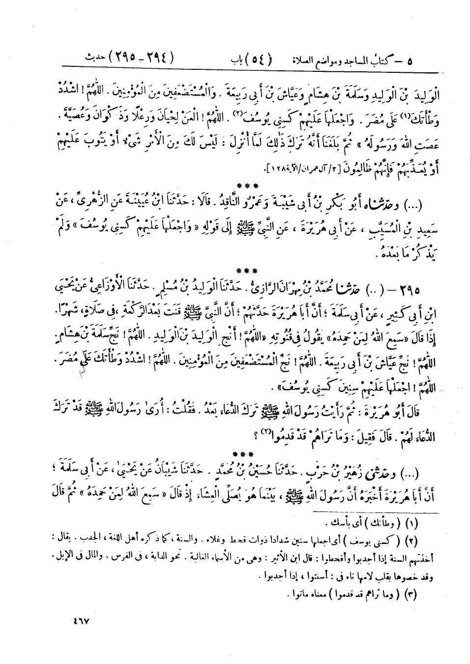 295 - (675) حَدَّثَنَا مُحَمَّدُ بْنُ مِهْرَانَ الرَّازِيُّ، حَدَّثَنَا الْوَلِيدُ بْنُ مُسْلِمٍ، حَدَّثَنَا الْأَوْزَاعِيُّ، عَنْ يَحْيَى بْنِ أَبِي كَثِيرٍ، عَنْ أَبِي سَلَمَةَ، أَنَّ أَبَا هُرَيْرَةَ، حَدَّثَهُمْ أَنَّ النَّبِيَّ صَلَّى اللهُ عَلَيْهِ وَسَلَّمَ قَنَتَ بَعْدَ الرَّكْعَةِ فِي صَلَاةٍ شَهْرًا، إِذَا قَالَ: «§سَمِعَ اللهُ لِمَنْ حَمِدَهُ»، يَقُولُ فِي قُنُوتِهِ: «اللهُمَّ أَنْجِ الْوَلِيدَ بْنَ الْوَلِيدَ، اللهُمَّ نَجِّ سَلَمَةَ بْنَ هِشَامٍ، اللهُمَّ نَجِّ عَيَّاشَ بْنَ أَبِي رَبِيعَةَ، اللهُمَّ نَجِّ الْمُسْتَضْعَفِينَ مِنَ الْمُؤْمِنِينَ، اللهُمَّ اشْدُدْ وَطْأَتَكَ عَلَى مُضَرَ، اللهُمَّ اجْعَلْهَا عَلَيْهِمْ سِنِينَ كَسِنِي يُوسُفَ» قَالَ أَبُو هُرَيْرَةَ: " ثُمَّ رَأَيْتُ رَسُولَ اللهِ صَلَّى اللهُ عَلَيْهِ وَسَلَّمَ تَرَكَ الدُّعَاءَ بَعْدُ، فَقُلْتُ: أُرَى رَسُولَ اللهِ صَلَّى اللهُ عَلَيْهِ وَسَلَّمَ قَدْ تَرَكَ الدُّعَاءَ لَهُمْ، قَالَ: فَقِيلَ: وَمَا تُرَاهُمْ قَدْ قَدِمُوا "