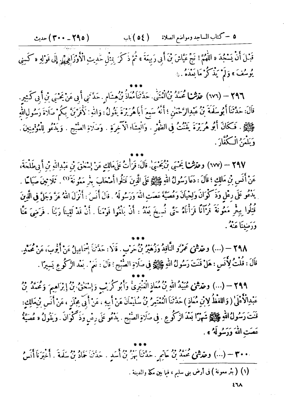 300 - (677) وَحَدَّثَنِي مُحَمَّدُ بْنُ حَاتِمٍ، حَدَّثَنَا بَهْزُ بْنُ أَسَدٍ، حَدَّثَنَا حَمَّادُ بْنُ سَلَمَةَ، أَخْبَرَنَا أَنَسُ بْنُ سِيرِينَ، عَنْ أَنَسِ بْنِ مَالِكٍ: «أَنَّ رَسُولَ اللهِ صَلَّى اللهُ عَلَيْهِ وَسَلَّمَ §قَنَتَ شَهْرًا بَعْدَ الرُّكُوعِ فِي صَلَاةِ الْفَجْرِ يَدْعُو عَلَى بَنِي عُصَيَّةَ»