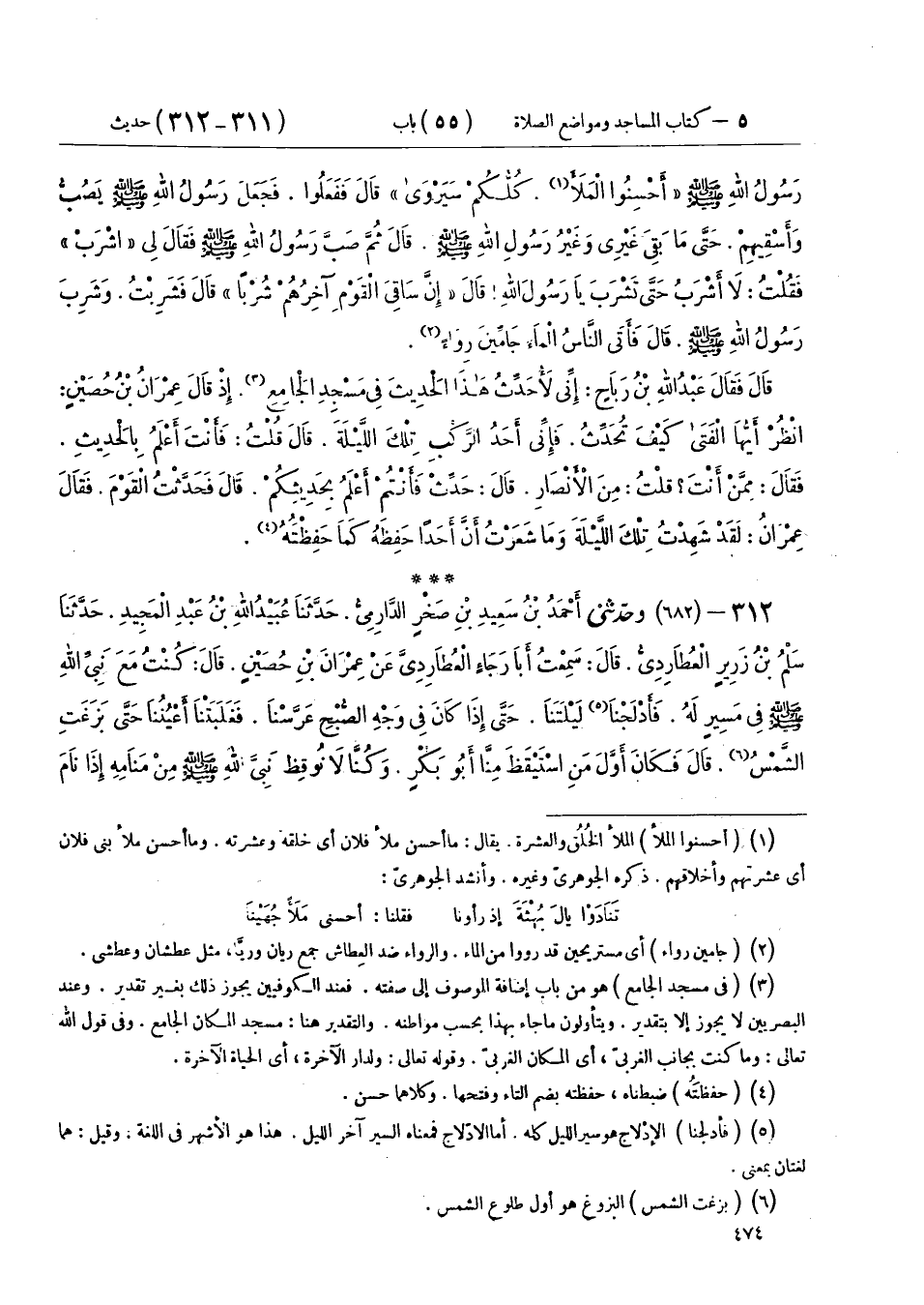 312 - (682) وَحَدَّثَنِي أَحْمَدُ بْنُ سَعِيدِ بْنِ صَخْرٍ الدَّارِمِيُّ، حَدَّثَنَا عُبَيْدُ اللهِ بْنُ عَبْدِ الْمَجِيدِ، حَدَّثَنَا سَلْمُ بْنُ زَرِيرٍ الْعُطَارِدِيُّ، قَالَ: سَمِعْتُ أَبَا رَجَاءٍ الْعُطَارِدِيَّ، عَنْ عِمْرَانَ بْنِ حُصَيْنٍ، قَالَ: كُنْتُ مَعَ نَبِيِّ اللهِ صَلَّى اللهُ عَلَيْهِ وَسَلَّمَ فِي مَسِيرٍ لَهُ، فَأَدْلَجْنَا لَيْلَتَنَا، حَتَّى إِذَا كَانَ فِي وَجْهِ الصُّبْحِ عَرَّسْنَا، فَغَلَبَتْنَا أَعْيُنُنَا حَتَّى بَزَغَتِ الشَّمْسُ، قَالَ: فَكَانَ أَوَّلَ مَنِ اسْتَيْقَظَ مِنَّا أَبُو بَكْرٍ، وَكُنَّا لَا نُوقِظُ نَبِيَّ اللهِ صَلَّى اللهُ عَلَيْهِ وَسَلَّمَ مَنْ مَنَامِهِ إِذَا نَامَ -[475]- حَتَّى يَسْتَيْقِظَ، ثُمَّ اسْتَيْقَظَ عُمَرُ، فَقَامَ عِنْدَ نَبِيِّ اللهِ صَلَّى اللهُ عَلَيْهِ وَسَلَّمَ، فَجَعَلَ يُكَبِّرُ، وَيَرْفَعُ صَوْتَهُ بِالتَّكْبِيرِ حَتَّى اسْتَيْقَظَ رَسُولُ اللهِ صَلَّى اللهُ عَلَيْهِ وَسَلَّمَ، فَلَمَّا رَفَعَ رَأْسَهُ، وَرَأَى الشَّمْسَ قَدْ بَزَغَتْ، قَالَ: «ارْتَحِلُوا»، فَسَارَ بِنَا حَتَّى إِذَا ابْيَضَّتِ الشَّمْسُ نَزَلَ فَصَلَّى بِنَا الْغَدَاةَ، فَاعْتَزَلَ رَجُلٌ مِنَ الْقَوْمِ لَمْ يُصَلِّ مَعَنَا، فَلَمَّا انْصَرَفَ، قَالَ لَهُ رَسُولُ اللهِ صَلَّى اللهُ عَلَيْهِ وَسَلَّمَ: «يَا فُلَانُ §مَا مَنَعَكَ أَنْ تُصَلِّيَ مَعَنَا؟» قَالَ: يَا نَبِيَّ اللهِ أَصَابَتْنِي جَنَابَةٌ، فَأَمَرَهُ رَسُولُ اللهِ صَلَّى اللهُ عَلَيْهِ وَسَلَّمَ فَتَيَمَّمَ بِالصَّعِيدِ، فَصَلَّى، ثُمَّ عَجَّلَنِي فِي رَكْبٍ بَيْنَ يَدَيْهِ نَطْلُبُ الْمَاءَ، وَقَدْ عَطِشْنَا عَطَشًا شَدِيدًا، فَبَيْنَمَا نَحْنُ نَسِيرُ إِذَا نَحْنُ بِامْرَأَةٍ سَادِلَةٍ رِجْلَيْهَا بَيْنَ مَزَادَتَيْنِ، فَقُلْنَا لَهَا: أَيْنَ الْمَاءُ؟ قَالَتْ: أَيْهَاهْ أَيْهَاهْ، لَا مَاءَ لَكُمْ، قُلْنَا: فَكَمْ بَيْنَ أَهْلِكِ وَبَيْنَ الْمَاءِ؟ قَالَتْ: مَسِيرَةُ يَوْمٍ وَلَيْلَةٍ، قُلْنَا: انْطَلِقِي إِلَى رَسُولِ اللهِ صَلَّى اللهُ عَلَيْهِ وَسَلَّمَ، قَالَتْ: وَمَا رَسُولُ اللهِ؟ فَلَمْ نُمَلِّكْهَا مِنْ أَمْرِهَا شَيْئًا حَتَّى انْطَلَقْنَا بِهَا، فَاسْتَقْبَلْنَا بِهَا رَسُولَ اللهِ صَلَّى اللهُ عَلَيْهِ وَسَلَّمَ، فَسَأَلَهَا، فَأَخْبَرَتْهُ مِثْلَ الَّذِي أَخْبَرَتْنَا، وَأَخْبَرَتْهُ أَنَّهَا مُوتِمَةٌ لَهَا صِبْيَانٌ أَيْتَامٌ، فَأَمَرَ بِرَاوِيَتِهَا فَأُنِيخَتْ فَمَجَّ فِي الْعَزْلَاوَيْنِ الْعُلْيَاوَيْنِ، ثُمَّ بَعَثَ بِرَاوِيَتِهَا، فَشَرِبْنَا وَنَحْنُ أَرْبَعُونَ رَجُلًا عِطَاشٌ حَتَّى رَوِينَا، وَمَلَأْنَا كُلَّ قِرْبَةٍ مَعَنَا وَإِدَاوَةٍ، وَغَسَّلْنَا صَاحِبَنَا، غَيْرَ أَنَّا لَمْ نَسْقِ بَعِيرًا، وَهِيَ تَكَادُ تَنْضَرِجُ مِنَ الْمَاءِ - يَعْنِي الْمَزَادَتَيْنِ - ثُمَّ قَالَ: «هَاتُوا مَا كَانَ عِنْدَكُمْ»، فَجَمَعْنَا لَهَا مِنْ كِسَرٍ وَتَمْرٍ، وَصَرَّ لَهَا صُرَّةً، فَقَالَ لَهَا: «اذْهَبِي فَأَطْعِمِي هَذَا عِيَالَكِ، وَاعْلَمِي أَنَّا لَمْ نَرْزَأْ مِنْ مَائِكِ»، فَلَمَّا أَتَتْ أَهْلَهَا قَالَتْ: لَقَدْ لَقِيتُ أَسْحَرَ الْبَشَرِ، أَوْ إِنَّهُ لَنَبِيٌّ كَمَا زَعَمَ، كَانَ مِنْ أَمْرِهِ ذَيْتَ وَذَيْتَ، فَهَدَى اللهُ ذَاكَ الصِّرْمَ بِتِلْكَ الْمَرْأَةِ، فَأَسْلَمَتْ وَأَسْلَمُوا