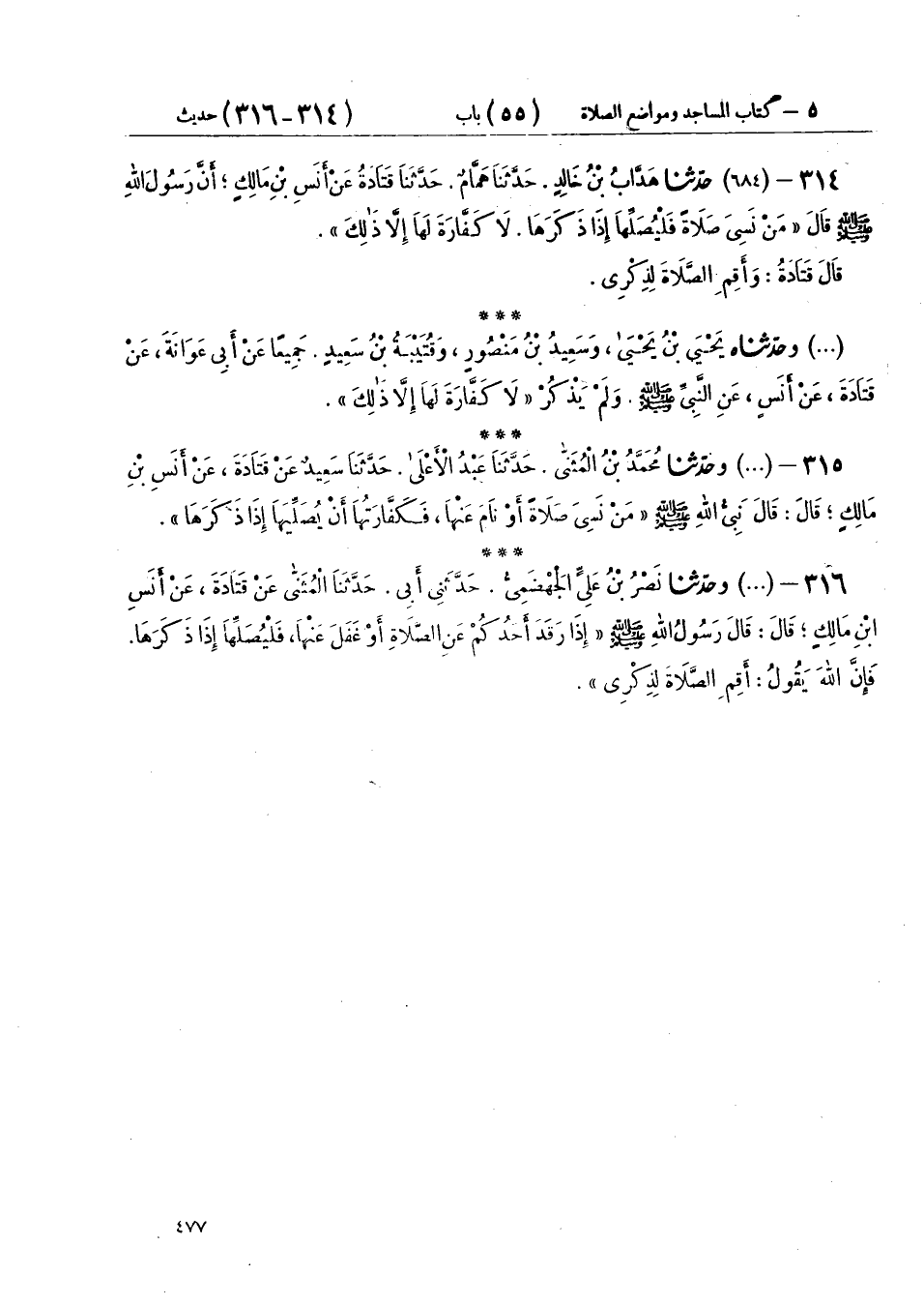 315 - (684) وَحَدَّثَنَا مُحَمَّدُ بْنُ الْمُثَنَّى، حَدَّثَنَا عَبْدُ الْأَعْلَى، حَدَّثَنَا سَعِيدٌ، عَنْ قَتَادَةَ، عَنْ أَنَسِ بْنِ مَالِكٍ، قَالَ: قَالَ نَبِيُّ اللهِ صَلَّى اللهُ عَلَيْهِ وَسَلَّمَ: «§مَنْ نَسِيَ صَلَاةً، أَوْ نَامَ عَنْهَا، فَكَفَّارَتُهَا أَنْ يُصَلِّيَهَا إِذَا ذَكَرَهَا»