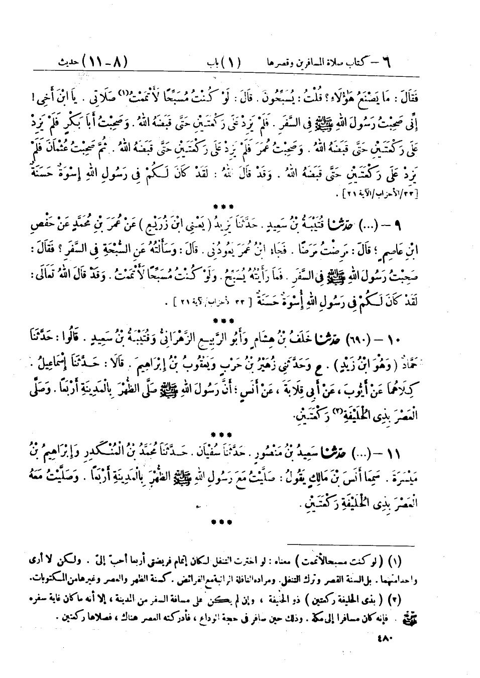 9 - (689) حَدَّثَنَا قُتَيْبَةُ بْنُ سَعِيدٍ، حَدَّثَنَا يَزِيدُ يَعْنِي ابْنَ زُرَيْعٍ، عَنْ عُمَرَ بْنِ مُحَمَّدٍ، عَنْ حَفْصِ بْنِ عَاصِمٍ، قَالَ: مَرِضْتُ مَرَضًا، فَجَاءَ ابْنُ عُمَرَ يَعُودُنِي، قَالَ: وَسَأَلْتُهُ عَنِ السُّبْحَةِ فِي السَّفَرِ، فَقَالَ: «§صَحِبْتُ رَسُولَ اللهِ صَلَّى اللهُ عَلَيْهِ وَسَلَّمَ فِي السَّفَرِ، فَمَا رَأَيْتُهُ يُسَبِّحُ»، وَلَوْ كُنْتُ مُسَبِّحًا لَأَتْمَمْتُ، وَقَدْ قَالَ اللهُ تَعَالَى: {لَقَدْ كَانَ لَكُمْ فِي رَسُولِ اللهِ أُسْوَةٌ حَسَنَةٌ} [الأحزاب: 21]