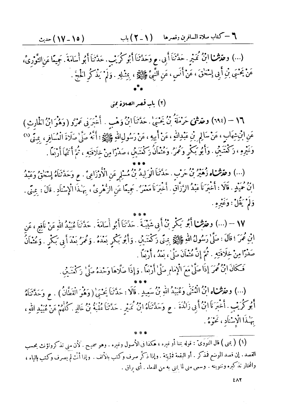 17 - (694) وَحَدَّثَنَا أَبُو بَكْرِ بْنُ أَبِي شَيْبَةَ، حَدَّثَنَا أَبُو أُسَامَةَ، حَدَّثَنَا عُبَيْدُ اللهِ، عَنْ نَافِعٍ، عَنِ ابْنِ عُمَرَ، قَالَ: «§صَلَّى رَسُولُ اللهِ صَلَّى اللهُ عَلَيْهِ وَسَلَّمَ بِمِنًى رَكْعَتَيْنِ، وَأَبُو بَكْرٍ بَعْدَهُ، وَعُمَرُ بَعْدَ أَبِي بَكْرٍ، وَعُثْمَانُ صَدْرًا مِنْ خِلَافَتِهِ، ثُمَّ إِنَّ عُثْمَانَ صَلَّى بَعْدُ أَرْبَعًا»، فَكَانَ ابْنُ عُمَرَ إِذَا صَلَّى مَعَ الْإِمَامِ صَلَّى أَرْبَعًا، وَإِذَا صَلَّاهَا وَحْدَهُ صَلَّى رَكْعَتَيْنِ