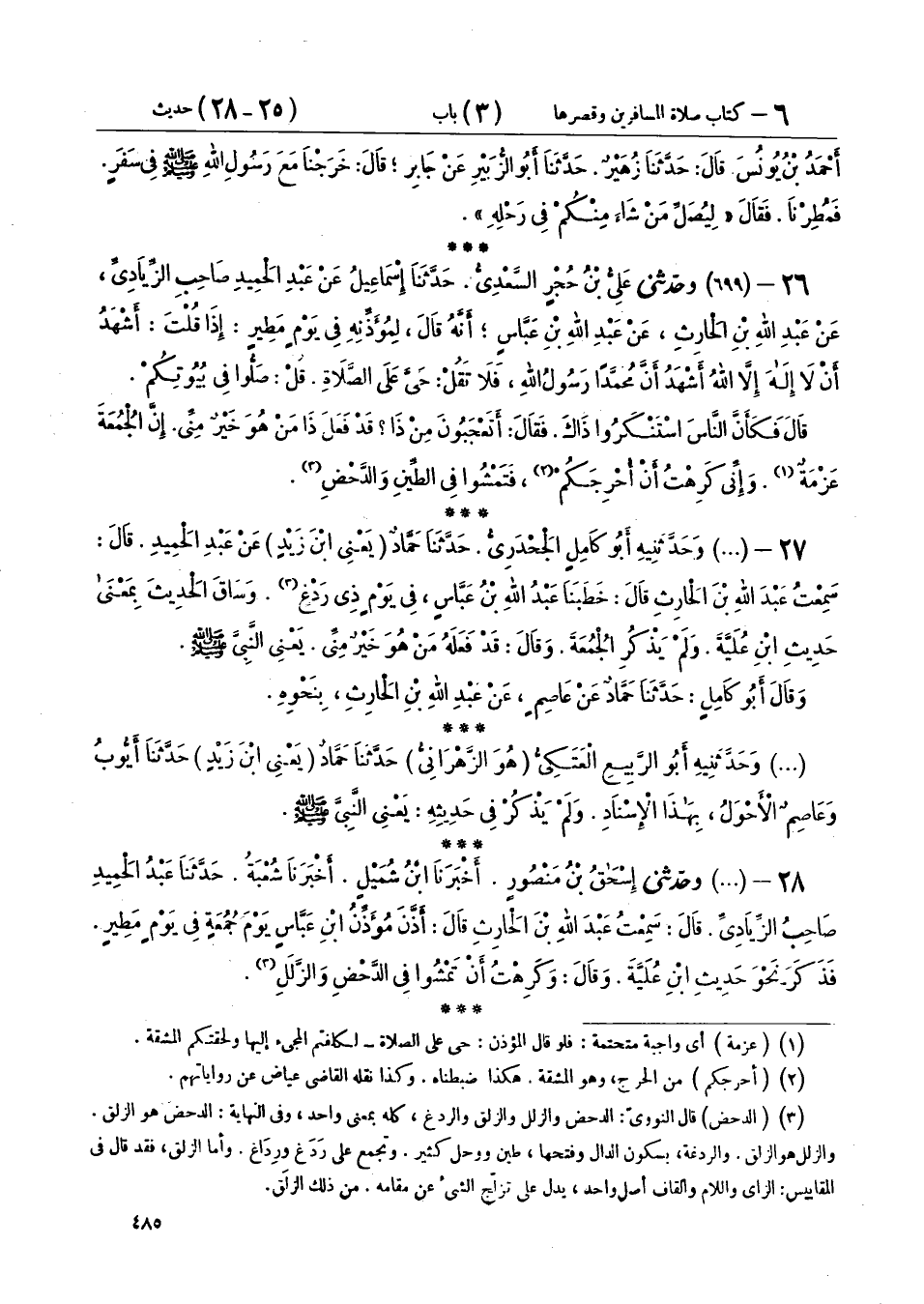 26 - (699) وَحَدَّثَنِي عَلِيُّ بْنُ حُجْرٍ السَّعْدِيُّ، حَدَّثَنَا إِسْمَاعِيلُ، عَنْ عَبْدِ الْحَمِيدِ، صَاحِبِ الزِّيَادِيِّ، عَنْ عَبْدِ اللهِ بْنِ الْحَارِثِ، عَنْ عَبْدِ اللهِ بْنِ عَبَّاسٍ، أَنَّهُ قَالَ لِمُؤَذِّنِهِ فِي يَوْمٍ مَطِيرٍ: " إِذَا قُلْتَ: أَشْهَدُ أَنْ لَا إِلَهَ إِلَّا اللهُ، أَشْهَدُ أَنَّ مُحَمَّدًا رَسُولُ اللهِ، فَلَا تَقُلْ: حَيَّ عَلَى الصَّلَاةِ، قُلْ: §صَلُّوا فِي بُيُوتِكُمْ "، قَالَ: فَكَأَنَّ النَّاسَ اسْتَنْكَرُوا ذَاكَ، فَقَالَ: «أَتَعْجَبُونَ مِنْ ذَا، قَدْ فَعَلَ ذَا مَنْ هُوَ خَيْرٌ مِنِّي، إِنَّ الْجُمُعَةَ عَزْمَةٌ، وَإِنِّي كَرِهْتُ أَنْ أُحْرِجَكُمْ فَتَمْشُوا فِي الطِّينِ وَالدَّحْضِ»