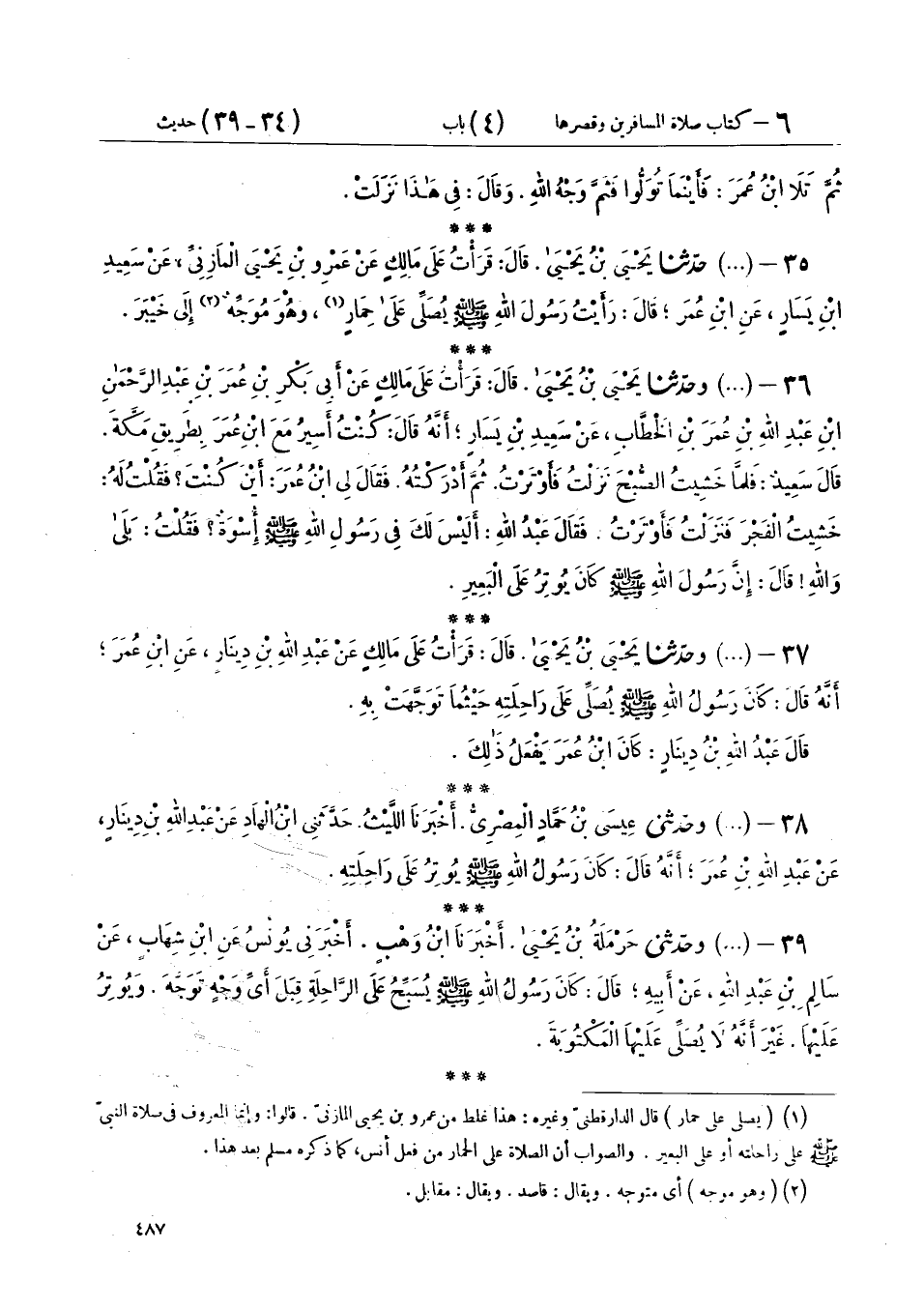 37 - (700) وَحَدَّثَنَا يَحْيَى بْنُ يَحْيَى، قَالَ: قَرَأْتُ عَلَى مَالِكٍ، عَنْ عَبْدِ اللهِ بْنِ دِينَارٍ، عَنِ ابْنِ عُمَرَ، أَنَّهُ قَالَ: «كَانَ رَسُولُ اللهِ صَلَّى اللهُ عَلَيْهِ وَسَلَّمَ §يُصَلِّي عَلَى رَاحِلَتِهِ حَيْثُمَا تَوَجَّهَتْ بِهِ» قَالَ عَبْدُ اللهِ بْنُ دِينَارٍ: كَانَ ابْنُ عُمَرَ يَفْعَلُ ذَلِكَ
