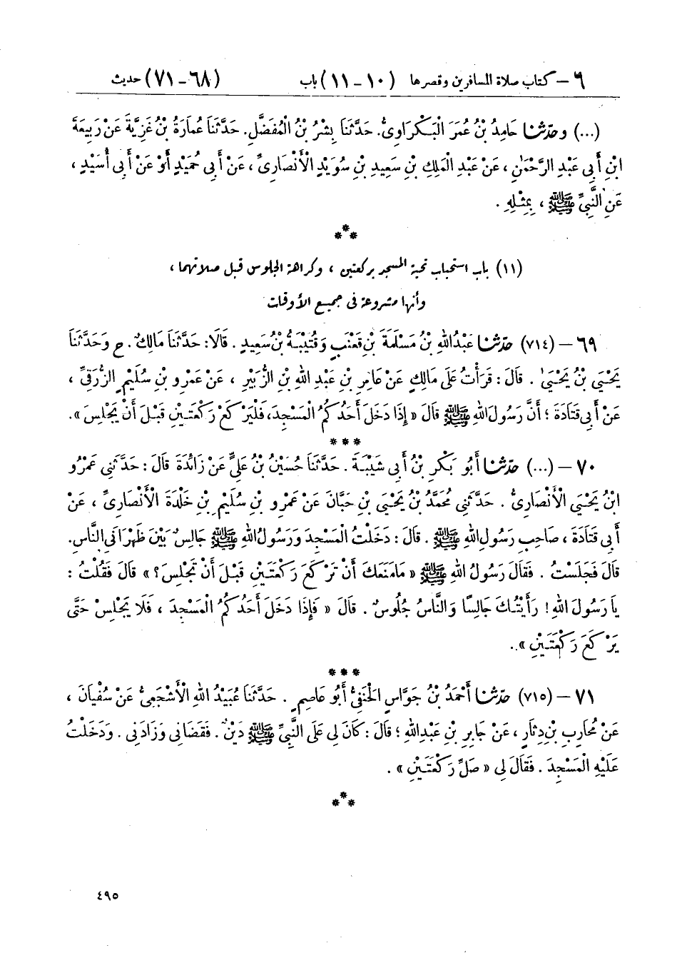 70 - (714) حَدَّثَنَا أَبُو بَكْرِ بْنُ أَبِي شَيْبَةَ، حَدَّثَنَا حُسَيْنُ بْنُ عَلِيٍّ، عَنْ زَائِدَةَ، قَالَ: حَدَّثَنِي عَمْرُو بْنُ يَحْيَى الْأَنْصَارِيُّ، حَدَّثَنِي مُحَمَّدُ بْنُ يَحْيَى بْنِ حَبَّانَ، عَنْ عَمْرِو بْنِ سُلَيْمِ بْنِ خَلْدَةَ الْأَنْصَارِيِّ، عَنْ أَبِي قَتَادَةَ - صَاحِبِ رَسُولِ اللهِ صَلَّى اللهُ عَلَيْهِ وَسَلَّمَ - قَالَ: دَخَلْتُ الْمَسْجِدَ وَرَسُولُ اللهِ صَلَّى اللهُ عَلَيْهِ وَسَلَّمَ جَالِسٌ بَيْنَ ظَهْرَانَيِ النَّاسِ، قَالَ: فَجَلَسْتُ، فَقَالَ رَسُولُ اللهِ صَلَّى اللهُ عَلَيْهِ وَسَلَّمَ: «مَا مَنَعَكَ أَنْ تَرْكَعَ رَكْعَتَيْنِ قَبْلَ أَنْ تَجْلِسَ؟» قَالَ: فَقُلْتُ: يَا رَسُولَ اللهِ رَأَيْتُكَ جَالِسًا وَالنَّاسُ جُلُوسٌ، قَالَ: «§فَإِذَا دَخَلَ أَحَدُكُمُ الْمَسْجِدَ، فَلَا يَجْلِسْ حَتَّى يَرْكَعَ رَكْعَتَيْنِ»
