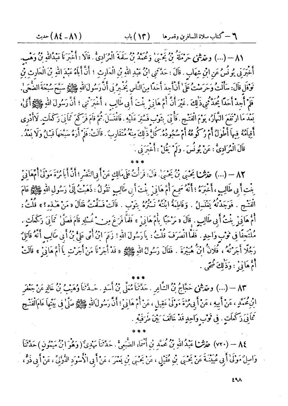 81 - (336) وحَدَّثَنِي حَرْمَلَةُ بْنُ يَحْيَى، وَمُحَمَّدُ بْنُ سَلَمَةَ الْمُرَادِيُّ، قَالَا: أَخْبَرَنَا عَبْدُ اللهِ بْنُ وَهْبٍ، أَخْبَرَنِي يُونُسُ، عَنِ ابْنِ شِهَابٍ، قَالَ: حَدَّثَنِي ابْنُ عَبْدِ اللهِ بْنِ الْحَارِثِ، أَنَّ أَبَاهُ عَبْدَ اللهِ بْنَ الْحَارِثِ بْنِ نَوْفَلٍ، قَالَ: سَأَلْتُ وَحَرَصْتُ عَلَى أَنْ أَجِدَ أَحَدًا مِنَ النَّاسِ يُخْبِرُنِي أَنَّ رَسُولَ اللهِ صَلَّى اللهُ عَلَيْهِ وَسَلَّمَ سَبَّحَ سُبْحَةَ الضُّحَى، فَلَمْ أَجِدْ أَحَدًا يُحَدِّثُنِي ذَلِكَ، غَيْرَ أَنَّ أُمَّ هَانِئٍ بِنْتَ أَبِي طَالِبٍ أَخْبَرَتْنِي، «أَنَّ رَسُولَ اللهِ صَلَّى اللهُ عَلَيْهِ وَسَلَّمَ §أَتَى بَعْدَ مَا ارْتَفَعَ النَّهَارُ يَوْمَ الْفَتْحِ، فَأُتِيَ بِثَوْبٍ فَسُتِرَ عَلَيْهِ، فَاغْتَسَلَ، ثُمَّ قَامَ فَرَكَعَ ثَمَانِيَ رَكَعَاتٍ، لَا أَدْرِي أَقِيَامُهُ فِيهَا أَطْوَلُ، أَمْ رُكُوعُهُ، أَمْ سُجُودُهُ، كُلُّ ذَلِكَ مِنْهُ مُتَقَارِبٌ»، قَالَتْ: «فَلَمْ أَرَهُ سَبَّحَهَا قَبْلُ وَلَا بَعْدُ». قَالَ الْمُرَادِيُّ، عَنْ يُونُسَ، وَلَمْ يَقُلْ: أَخْبَرَنِي