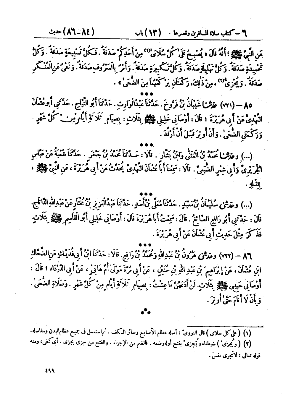 86 - (722) وحَدَّثَنِي هَارُونُ بْنُ عَبْدِ اللهِ، وَمُحَمَّدُ بْنُ رَافِعٍ، قَالَا: حَدَّثَنَا ابْنُ أَبِي فُدَيْكٍ، عَنِ الضَّحَّاكِ بْنِ عُثْمَانَ، عَنْ إِبْرَاهِيمَ بْنِ عَبْدِ اللهِ بْنِ حُنَيْنٍ، عَنْ أَبِي مُرَّةَ، مَوْلَى أُمِّ هَانِئٍ، عَنْ أَبِي الدَّرْدَاءِ، قَالَ: §أَوْصَانِي حَبِيبِي صَلَّى اللهُ عَلَيْهِ وَسَلَّمَ بِثَلَاثٍ، لَنْ أَدَعَهُنَّ مَا عِشْتُ: «بِصِيَامِ ثَلَاثَةِ أَيَّامٍ مِنْ كُلِّ شَهْرٍ، وَصَلَاةِ الضُّحَى، وَبِأَنْ لَا أَنَامَ حَتَّى أُوتِرَ»