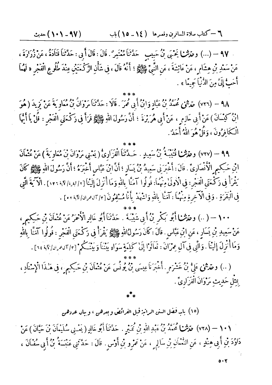 99 - (727) وحَدَّثَنَا قُتَيْبَةُ بْنُ سَعِيدٍ، حَدَّثَنَا الْفَزَارِيُّ يَعْنِي مَرْوَانَ بْنَ مُعَاوِيَةَ، عَنْ عُثْمَانَ بْنِ حَكِيمٍ الْأَنْصَارِيِّ، قَالَ: أَخْبَرَنِي سَعِيدُ بْنُ يَسَارٍ، أَنَّ ابْنَ عَبَّاسٍ، أَخْبَرَهُ أَنَّ رَسُولَ اللهِ صَلَّى اللهُ عَلَيْهِ وَسَلَّمَ، " كَانَ §يَقْرَأُ فِي رَكْعَتَيِ الْفَجْرِ فِي الْأُولَى مِنْهُمَا: {قُولُوا آمَنَّا بِاللهِ وَمَا أُنْزِلَ إِلَيْنَا} [البقرة: 136] الْآيَةَ الَّتِي فِي الْبَقَرَةِ، وَفِي الْآخِرَةِ مِنْهُمَا: {آمَنَّا بِاللهِ وَاشْهَدْ بِأَنَّا مُسْلِمُونَ} [آل عمران: 52] "