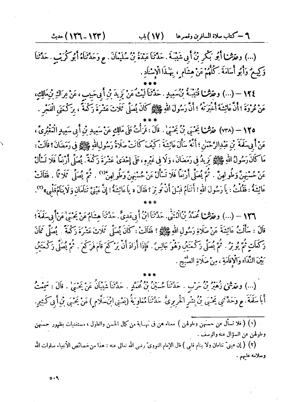 (738) وحَدَّثَنِي زُهَيْرُ بْنُ حَرْبٍ، حَدَّثَنَا حُسَيْنُ بْنُ مُحَمَّدٍ، حَدَّثَنَا شَيْبَانُ، عَنْ يَحْيَى، قَالَ: سَمِعْتُ أَبَا سَلَمَةَ، ح وحَدَّثَنِي يَحْيَى بْنُ بِشْرٍ الْحَرِيرِيُّ، حَدَّثَنَا مُعَاوِيَةُ يَعْنِي ابْنَ سَلَّامٍ، عَنْ يَحْيَى بْنِ أَبِي كَثِيرٍ، قَالَ: أَخْبَرَنِي أَبُو سَلَمَةَ، أَنَّهُ سَأَلَ عَائِشَةَ، عَنْ صَلَاةِ رَسُولِ اللهِ صَلَّى اللهُ عَلَيْهِ وَسَلَّمَ بِمِثْلِهِ، غَيْرَ أَنَّ فِي حَدِيثِهِمَا تِسْعَ رَكَعَاتِ قَائِمًا يُوتِرُ مِنْهُنَّ