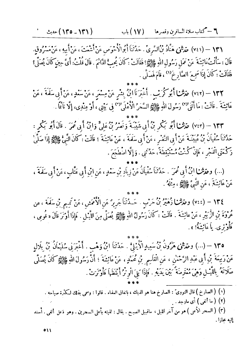 131 - (741) حَدَّثَنِي هَنَّادُ بْنُ السَّرِيِّ، حَدَّثَنَا أَبُو الْأَحْوَصِ، عَنْ أَشْعَثَ، عَنْ أَبِيهِ، عَنْ مَسْرُوقٍ، قَالَ: سَأَلْتُ عَائِشَةَ عَنْ عَمَلِ رَسُولِ اللهِ صَلَّى اللهُ عَلَيْهِ وَسَلَّمَ، فَقَالَتْ: «كَانَ يُحِبُّ الدَّائِمَ»، قَالَ: قُلْتُ: أَيَّ حِينٍ كَانَ يُصَلِّي؟ فَقَالَتْ: «كَانَ §إِذَا سَمِعَ الصَّارِخَ، قَامَ فَصَلَّى»
