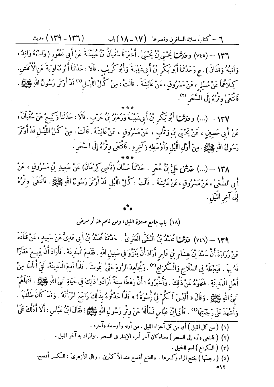 136 - (745) وحَدَّثَنَا يَحْيَى بْنُ يَحْيَى، أَخْبَرَنَا سُفْيَانُ بْنُ عُيَيْنَةَ، عَنْ أَبِي يَعْفُورٍ وَاسْمُهُ وَاقِدٌ وَلَقَبُهُ وَقْدَانُ، ح وحَدَّثَنَا أَبُو بَكْرِ بْنُ أَبِي شَيْبَةَ، وَأَبُو كُرَيْبٍ، قَالَا: حَدَّثَنَا أَبُو مُعَاوِيَةَ، عَنِ الْأَعْمَشِ، كِلَاهُمَا عَنْ مُسْلِمٍ، عَنْ مَسْرُوقٍ، عَنْ عَائِشَةَ، قَالَتْ: «§مِنْ كُلِّ اللَّيْلِ قَدْ أَوْتَرَ رَسُولُ اللهِ صَلَّى اللهُ عَلَيْهِ وَسَلَّمَ، فَانْتَهَى وِتْرُهُ إِلَى السَّحَرِ»