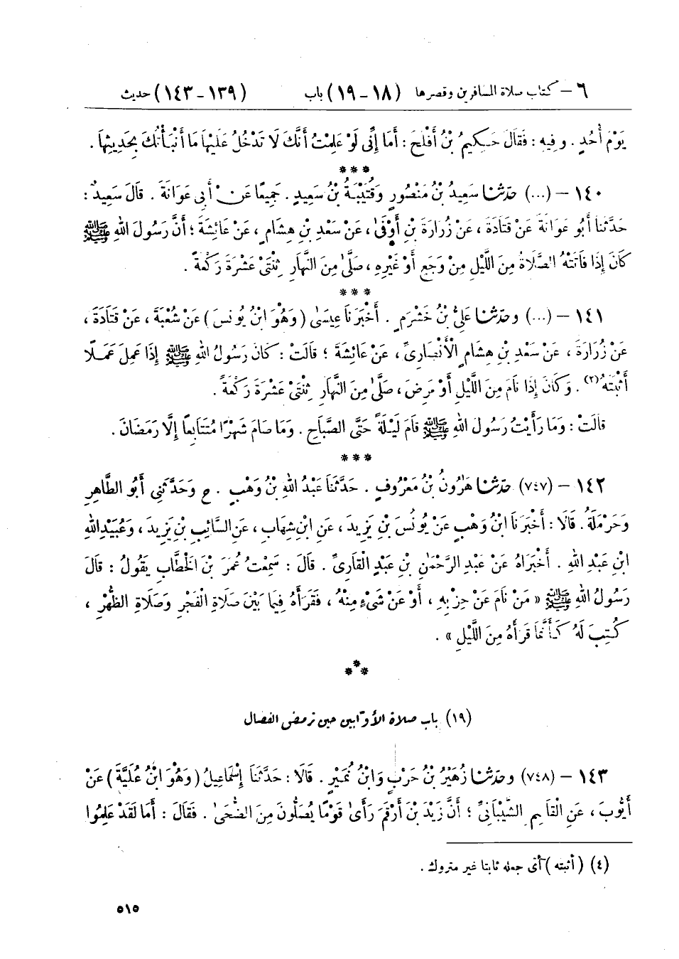 141 - (746) وحَدَّثَنَا عَلِيُّ بْنُ خَشْرَمٍ، أَخْبَرَنَا عِيسَى وَهُو ابْنُ يُونُسَ، عَنْ شُعْبَةَ، عَنْ قَتَادَةَ، عَنْ زُرَارَةَ، عَنْ سَعْدِ بْنِ هِشَامٍ الْأَنْصَارِيِّ، عَنْ عَائِشَةَ، قَالَتْ: «كَانَ رَسُولُ اللهِ صَلَّى اللهُ عَلَيْهِ وَسَلَّمَ §إِذَا عَمِلَ عَمَلًا أَثْبَتَهُ، وَكَانَ إِذَا نَامَ مِنَ اللَّيْلِ، أَوْ مَرِضَ، صَلَّى مِنَ النَّهَارِ ثِنْتَيْ عَشْرَةَ رَكْعَةً»