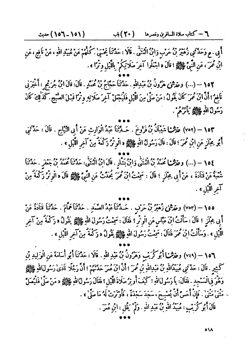 152 - (751) وحَدَّثَنِي هَارُونُ بْنُ عَبْدِ اللهِ، حَدَّثَنَا حَجَّاجُ بْنُ مُحَمَّدٍ، قَالَ: قَالَ ابْنُ جُرَيْجٍ: أَخْبَرَنِي نَافِعٌ، أَنَّ ابْنَ عُمَرَ، كَانَ يَقُولُ: «§مَنْ صَلَّى مِنَ اللَّيْلِ فَلْيَجْعَلْ آخِرَ صَلَاتِهِ وِتْرًا قَبْلَ الصُّبْحِ، كَذَلِكَ كَانَ رَسُولُ اللهِ صَلَّى اللهُ عَلَيْهِ وَسَلَّمَ يَأْمُرُهُمْ»