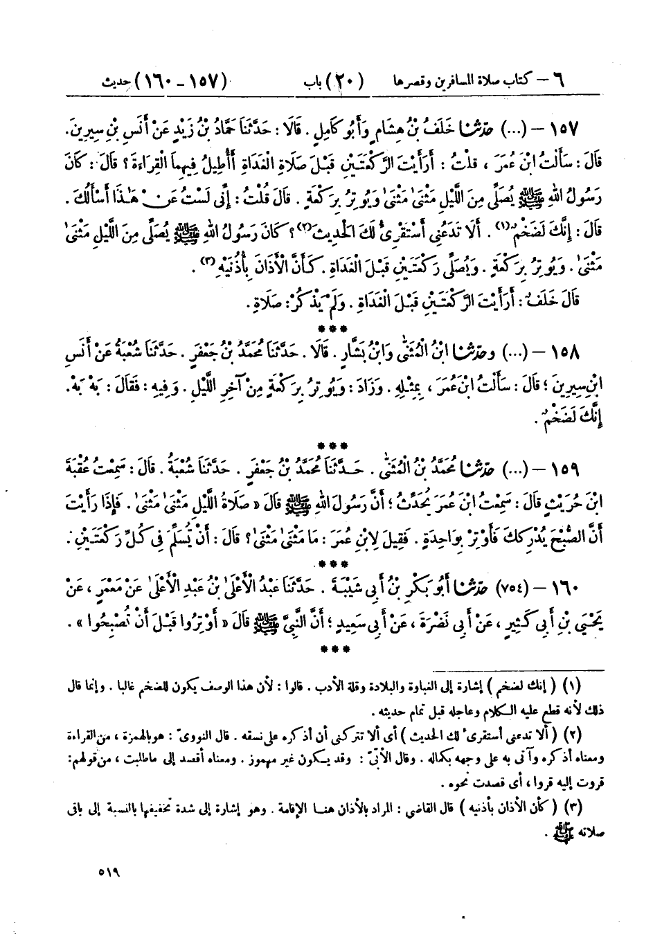 157 - (749) حَدَّثَنَا خَلَفُ بْنُ هِشَامٍ، وَأَبُو كَامِلٍ، قَالَا: حَدَّثَنَا حَمَّادُ بْنُ زَيْدٍ، عَنْ أَنَسِ بْنِ سِيرِينَ، قَالَ: سَأَلْتُ ابْنَ عُمَرَ، قُلْتُ: أَرَأَيْتَ الرَّكْعَتَيْنِ قَبْلَ صَلَاةِ الْغَدَاةِ، أَأُطِيلُ فِيهِمَا الْقِرَاءَةَ؟ قَالَ: «كَانَ رَسُولُ اللهِ صَلَّى اللهُ عَلَيْهِ وَسَلَّمَ يُصَلِّي مِنَ اللَّيْلِ مَثْنَى مَثْنَى، وَيُوتِرُ بِرَكْعَةٍ»، قَالَ: قُلْتُ: إِنِّي لَسْتُ عَنْ هَذَا أَسْأَلُكَ، قَالَ: إِنَّكَ لَضَخْمٌ، أَلَا تَدَعُنِي أَسْتَقْرِئُ لَكَ الْحَدِيثَ، «كَانَ رَسُولُ اللهِ صَلَّى اللهُ عَلَيْهِ وَسَلَّمَ §يُصَلِّي مِنَ اللَّيْلِ مَثْنَى مَثْنَى، وَيُوتِرُ بِرَكْعَةٍ، وَيُصَلِّي رَكْعَتَيْنِ قَبْلَ الْغَدَاةِ كَأَنَّ الْأَذَانَ بِأُذُنَيْهِ». قَالَ خَلَفٌ: أَرَأَيْتَ الرَّكْعَتَيْنِ قَبْلَ الْغَدَاةِ، وَلَمْ يَذْكُرْ صَلَاةِ.