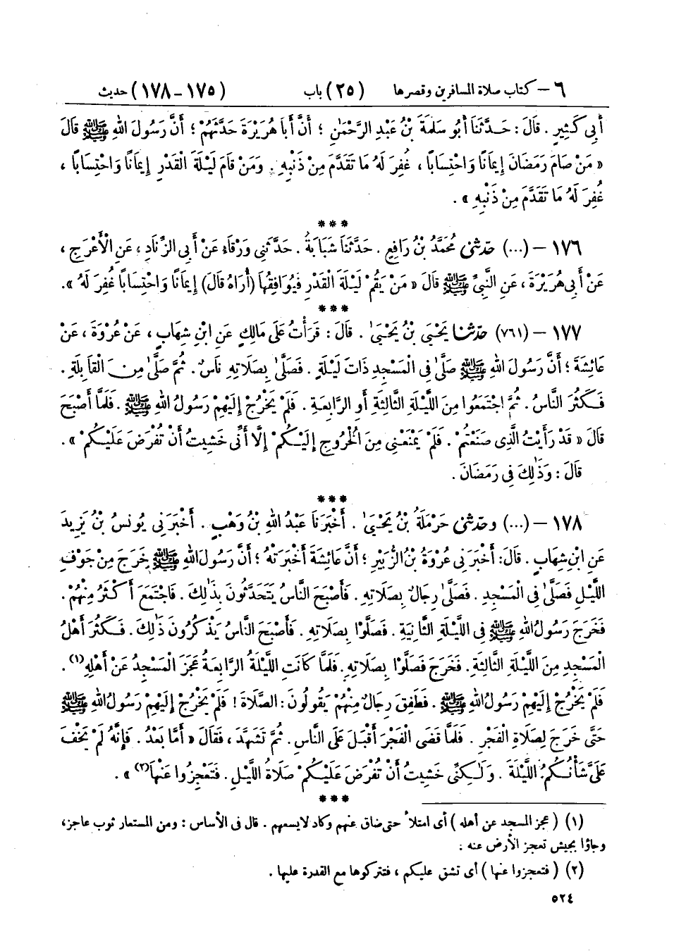 177 - (761) حَدَّثَنَا يَحْيَى بْنُ يَحْيَى، قَالَ قَرَأْتُ عَلَى مَالِكٍ، عَنِ ابْنِ شِهَابٍ، عَنْ عُرْوَةَ، عَنْ عَائِشَةَ، أَنَّ رَسُولَ اللهِ صَلَّى اللهُ عَلَيْهِ وَسَلَّمَ صَلَّى فِي الْمَسْجِدِ ذَاتَ لَيْلَةٍ، فَصَلَّى بِصَلَاتِهِ نَاسٌ، ثُمَّ صَلَّى مِنَ الْقَابِلَةِ، فَكَثُرَ النَّاسُ، ثُمَّ اجْتَمَعُوا مِنَ اللَّيْلَةِ الثَّالِثَةِ، أَوِ الرَّابِعَةِ فَلَمْ يَخْرُجْ إِلَيْهِمْ رَسُولُ اللهِ صَلَّى اللهُ عَلَيْهِ وَسَلَّمَ، فَلَمَّا أَصْبَحَ، قَالَ: «قَدْ رَأَيْتُ الَّذِي صَنَعْتُمْ، §فَلَمْ يَمْنَعْنِي مِنَ الْخُرُوجِ إِلَيْكُمْ إِلَّا أَنِّي خَشِيتُ أَنْ تُفْرَضَ عَلَيْكُمْ»، قَالَ: وَذَلِكَ فِي رَمَضَانَ
