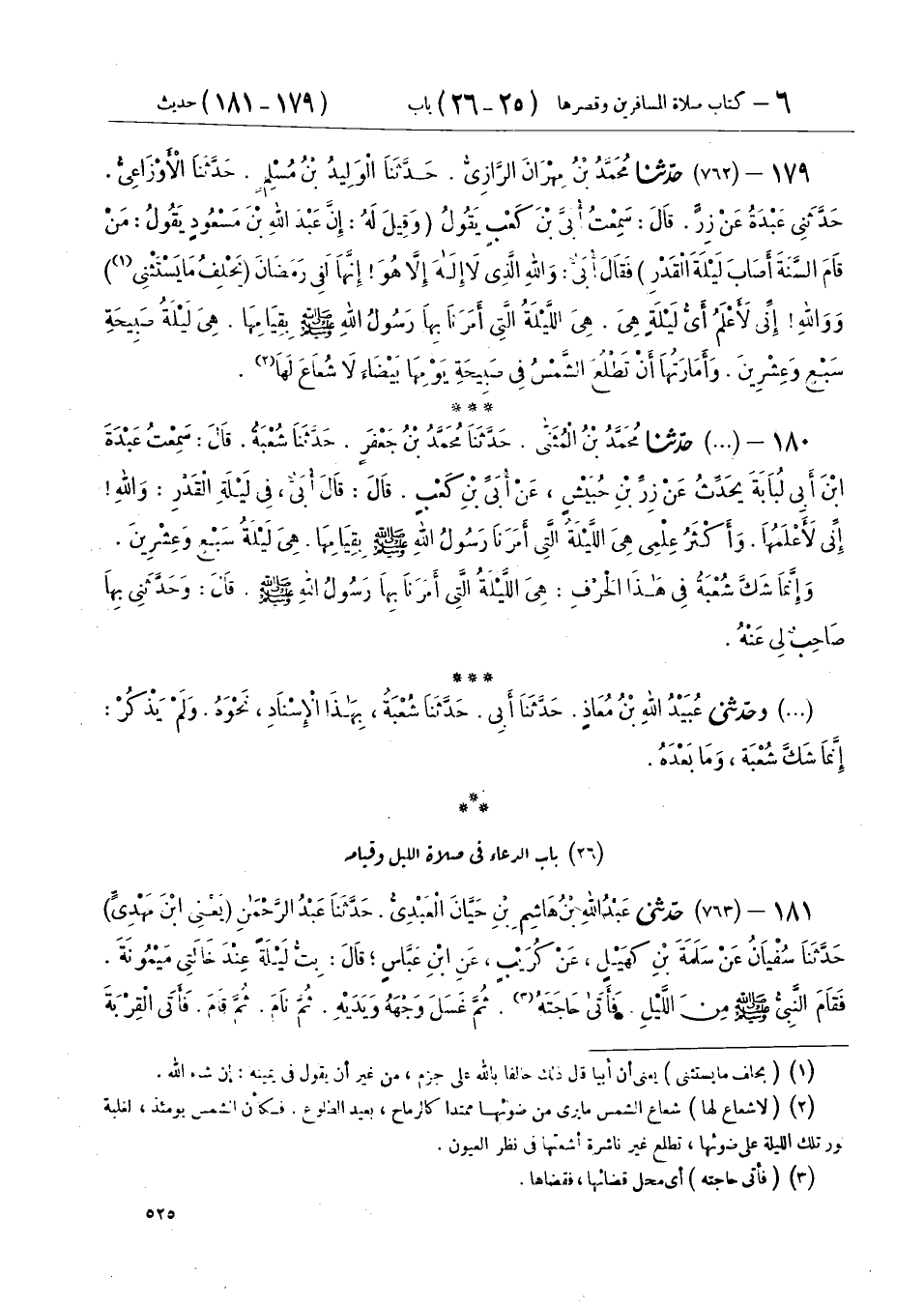 179 - (762) حَدَّثَنَا مُحَمَّدُ بْنُ مِهْرَانَ الرَّازِيُّ، حَدَّثَنَا الْوَلِيدُ بْنُ مُسْلِمٍ، حَدَّثَنَا الْأَوْزَاعِيُّ، حَدَّثَنِي عَبْدَةُ، عَنْ زِرٍّ، قَالَ: سَمِعْتُ أُبَيَّ بْنَ كَعْبٍ، يَقُولُ: وَقِيلَ لَهُ إِنَّ عَبْدَ اللهِ بْنَ مَسْعُودٍ، يَقُولُ: «مَنْ قَامَ السَّنَةَ أَصَابَ لَيْلَةَ الْقَدْرِ»، فَقَالَ أُبَيٌّ: «وَاللهِ الَّذِي لَا إِلَهَ إِلَّا هُوَ، إِنَّهَا لَفِي رَمَضَانَ، يَحْلِفُ مَا يَسْتَثْنِي، وَوَاللهِ إِنِّي لَأَعْلَمُ أَيُّ لَيْلَةٍ هِيَ، هِيَ اللَّيْلَةُ الَّتِي أَمَرَنَا بِهَا رَسُولُ اللهِ صَلَّى اللهُ عَلَيْهِ وَسَلَّمَ بِقِيَامِهَا، §هِيَ لَيْلَةُ صَبِيحَةِ سَبْعٍ وَعِشْرِينَ، وَأَمَارَتُهَا أَنْ تَطْلُعَ الشَّمْسُ فِي صَبِيحَةِ يَوْمِهَا بَيْضَاءَ لَا شُعَاعَ لَهَا»