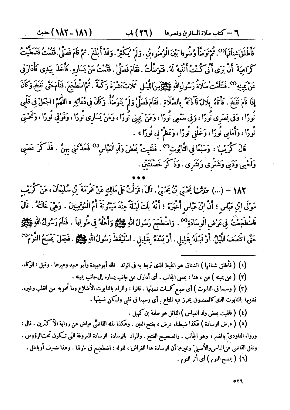 182 - (763) حَدَّثَنَا يَحْيَى بْنُ يَحْيَى، قَالَ: قَرَأْتُ عَلَى مَالِكٍ، عَنْ مَخْرَمَةَ بْنِ سُلَيْمَانَ، عَنْ كُرَيْبٍ، مَوْلَى ابْنِ عَبَّاسٍ، أَنَّ ابْنَ عَبَّاسٍ أَخْبَرَهُ، أَنَّهُ بَاتَ لَيْلَةً عِنْدَ مَيْمُونَةَ أُمِّ الْمُؤْمِنِينَ، وَهِيَ خَالَتُهُ، قَالَ: فَاضْطَجَعْتُ فِي عَرْضِ الْوِسَادَةِ، وَاضْطَجَعَ رَسُولُ اللهِ صَلَّى اللهُ عَلَيْهِ وَسَلَّمَ وَأَهْلُهُ فِي طُولِهَا، فَنَامَ رَسُولُ اللهِ صَلَّى اللهُ عَلَيْهِ وَسَلَّمَ حَتَّى انْتَصَفَ اللَّيْلُ، أَوْ قَبْلَهُ بِقَلِيلٍ، أَوْ بَعْدَهُ بِقَلِيلٍ، اسْتَيْقَظَ رَسُولُ اللهِ صَلَّى اللهُ عَلَيْهِ وَسَلَّمَ، §فَجَعَلَ يَمْسَحُ النَّوْمَ عَنْ وَجْهِهِ بِيَدِهِ، ثُمَّ قَرَأَ الْعَشْرَ الْآيَاتِ الْخَوَاتِمَ مِنْ سُورَةِ آلِ عِمْرَانَ، ثُمَّ قَامَ إِلَى شَنٍّ مُعَلَّقَةٍ، فَتَوَضَّأَ مِنْهَا فَأَحْسَنَ وُضُوءَهُ، ثُمَّ قَامَ فَصَلَّى، قَالَ ابْنُ عَبَّاسٍ: فَقُمْتُ فَصَنَعْتُ مِثْلَ مَا صَنَعَ رَسُولُ اللهِ صَلَّى اللهُ عَلَيْهِ وَسَلَّمَ، ثُمَّ ذَهَبْتُ فَقُمْتُ إِلَى جَنْبِهِ، فَوَضَعَ رَسُولُ اللهِ صَلَّى اللهُ عَلَيْهِ وَسَلَّمَ يَدَهُ الْيُمْنَى عَلَى رَأْسِي، وَأَخَذَ بِأُذُنِي الْيُمْنَى يَفْتِلُهَا، فَصَلَّى رَكْعَتَيْنِ، ثُمَّ رَكْعَتَيْنِ، ثُمَّ رَكْعَتَيْنِ، ثُمَّ رَكْعَتَيْنِ، ثُمَّ رَكْعَتَيْنِ، ثُمَّ رَكْعَتَيْنِ، ثُمَّ أَوْتَرَ، ثُمَّ اضْطَجَعَ حَتَّى جَاءَ الْمُؤَذِّنُ، فَقَامَ فَصَلَّى رَكْعَتَيْنِ خَفِيفَتَيْنِ، ثُمَّ خَرَجَ فَصَلَّى الصُّبْحَ.