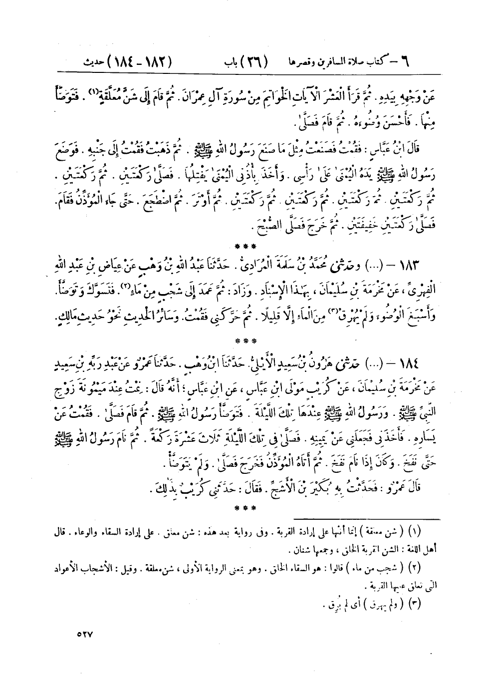 184 - (763) حَدَّثَنِي هَارُونُ بْنُ سَعِيدٍ الْأَيْلِيُّ، حَدَّثَنَا ابْنُ وَهْبٍ، حَدَّثَنَا عَمْرٌو، عَنْ عَبْدِ رَبِّهِ بْنِ سَعِيدٍ، عَنْ مَخْرَمَةَ بْنِ سُلَيْمَانَ، عَنْ كُرَيْبٍ، مَوْلَى ابْنِ عَبَّاسٍ، عَنِ ابْنِ عَبَّاسٍ، أَنَّهُ قَالَ: نِمْتُ عِنْدَ مَيْمُونَةَ، زَوْجِ النَّبِيِّ صَلَّى اللهُ عَلَيْهِ وَسَلَّمَ، وَرَسُولُ اللهِ صَلَّى اللهُ عَلَيْهِ وَسَلَّمَ عِنْدَهَا تِلْكَ اللَّيْلَةَ، «§فَتَوَضَّأَ رَسُولُ اللهِ صَلَّى اللهُ عَلَيْهِ وَسَلَّمَ، ثُمَّ قَامَ فَصَلَّى، فَقُمْتُ عَنْ يَسَارِهِ، فَأَخَذَنِي فَجَعَلَنِي عَنْ يَمِينِهِ، فَصَلَّى فِي تِلْكَ اللَّيْلَةِ ثَلَاثَ عَشْرَةَ رَكْعَةً، ثُمَّ نَامَ رَسُولُ اللهِ صَلَّى اللهُ عَلَيْهِ وَسَلَّمَ حَتَّى نَفَخَ، وَكَانَ إِذَا نَامَ نَفَخَ، ثُمَّ أَتَاهُ الْمُؤَذِّنُ فَخَرَجَ فَصَلَّى، وَلَمْ يَتَوَضَّأْ». قَالَ عَمْرٌو: فَحَدَّثْتُ بِهِ بُكَيْرَ بْنَ الْأَشَجِّ، فَقَالَ: حَدَّثَنِي كُرَيْبٌ بِذَلِكَ