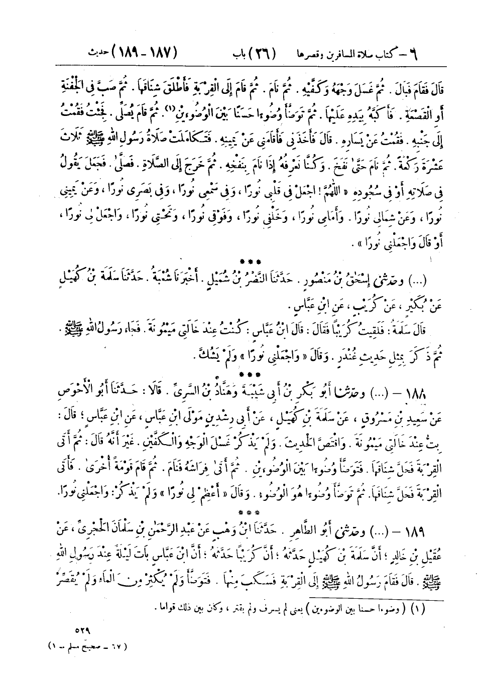 188 - (763) وحَدَّثَنَا أَبُو بَكْرِ بْنُ أَبِي شَيْبَةَ، وَهَنَّادُ بْنُ السَّرِيِّ، قَالَا: حَدَّثَنَا أَبُو الْأَحْوَصِ، عَنْ سَعِيدِ بْنِ مَسْرُوقٍ، عَنْ سَلَمَةَ بْنِ كُهَيْلٍ، عَنْ أَبِي رِشْدِينٍ، مَوْلَى ابْنِ عَبَّاسٍ، عَنِ ابْنِ عَبَّاسٍ، قَالَ: بِتُّ عِنْدَ خَالَتِي مَيْمُونَةَ، وَاقْتَصَّ الْحَدِيثَ، وَلَمْ يَذْكُرْ غَسْلَ الْوَجْهِ وَالْكَفَّيْنِ، غَيْرَ أَنَّهُ قَالَ: ثُمَّ أَتَى الْقِرْبَةَ فَحَلَّ شِنَاقَهَا فَتَوَضَّأَ وُضُوءًا بَيْنَ الْوُضُوءَيْنِ، ثُمَّ أَتَى فِرَاشَهُ فَنَامَ، ثُمَّ قَامَ قَوْمَةً أُخْرَى، فَأَتَى الْقِرْبَةَ فَحَلَّ شِنَاقَهَا، ثُمَّ تَوَضَّأَ وُضُوءًا هُوَ الْوُضُوءُ، وَقَالَ: «أَعْظِمْ لِي نُورًا»، وَلَمْ يَذْكُرْ «وَاجْعَلْنِي نُورًا».