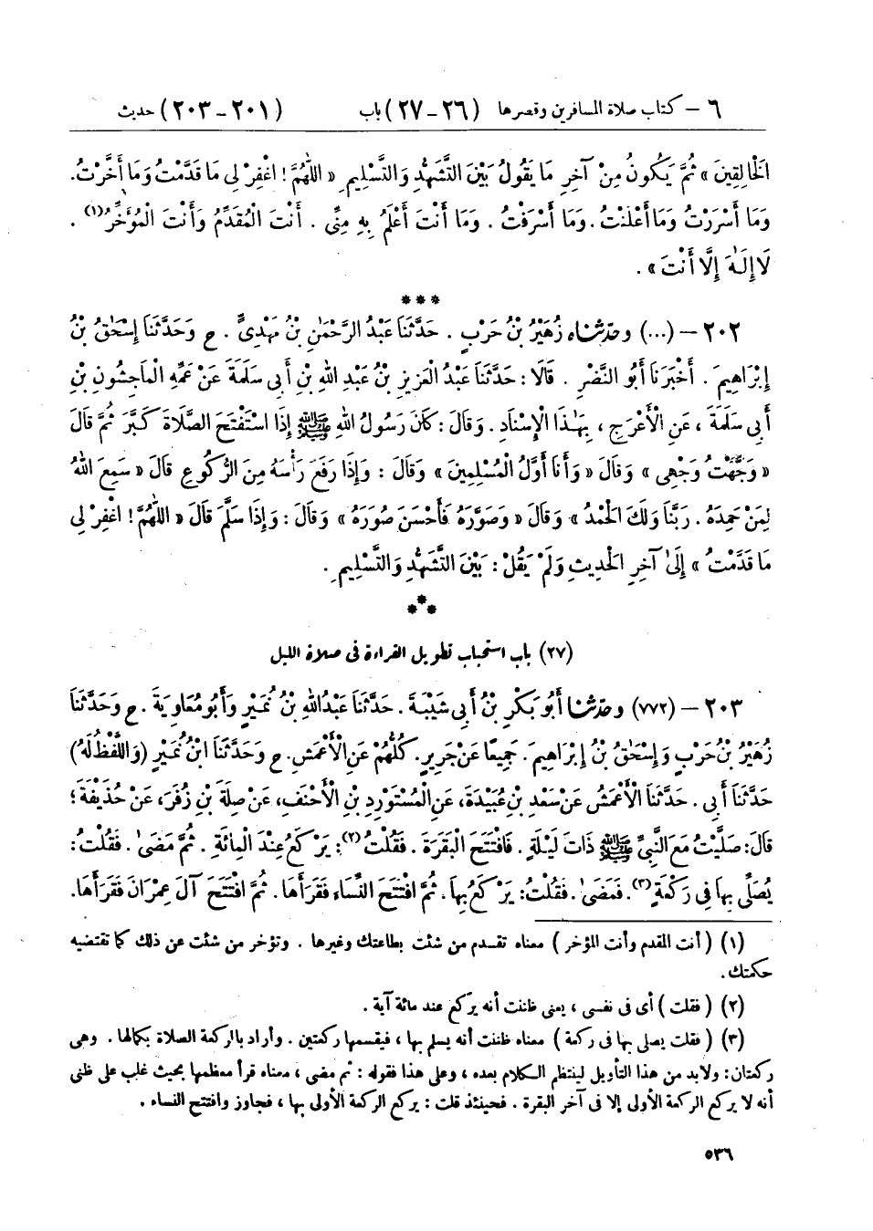 203 - (772) وحَدَّثَنَا أَبُو بَكْرِ بْنُ أَبِي شَيْبَةَ، حَدَّثَنَا عَبْدُ اللهِ بْنُ نُمَيْرٍ، وَأَبُو مُعَاوِيَةَ، ح وحَدَّثَنَا زُهَيْرُ بْنُ حَرْبٍ، وَإِسْحَاقُ بْنُ إِبْرَاهِيمَ، جَمِيعًا عَنْ جَرِيرٍ، كُلُّهُمْ عَنِ الْأَعْمَشِ، ح وحَدَّثَنَا ابْنُ نُمَيْرٍ، وَاللَّفْظُ لَهُ، حَدَّثَنَا أَبِي، حَدَّثَنَا الْأَعْمَشُ، عَنْ سَعْدِ بْنِ عُبَيْدَةَ، عَنِ الْمُسْتَوْرِدِ بْنِ الْأَحْنَفِ، عَنْ صِلَةَ بْنِ زُفَرَ، عَنْ حُذَيْفَةَ، قَالَ: صَلَّيْتُ مَعَ النَّبِيِّ صَلَّى اللهُ عَلَيْهِ وَسَلَّمَ ذَاتَ لَيْلَةٍ، فَافْتَتَحَ الْبَقَرَةَ، فَقُلْتُ: يَرْكَعُ عِنْدَ الْمِائَةِ، ثُمَّ مَضَى، فَقُلْتُ: يُصَلِّي بِهَا فِي رَكْعَةٍ، فَمَضَى، فَقُلْتُ: يَرْكَعُ بِهَا، ثُمَّ افْتَتَحَ النِّسَاءَ، فَقَرَأَهَا، ثُمَّ افْتَتَحَ آلَ عِمْرَانَ، فَقَرَأَهَا، يَقْرَأُ مُتَرَسِّلًا، إِذَا مَرَّ بِآيَةٍ فِيهَا تَسْبِيحٌ سَبَّحَ، وَإِذَا مَرَّ بِسُؤَالٍ سَأَلَ، وَإِذَا مَرَّ بِتَعَوُّذٍ تَعَوَّذَ، ثُمَّ رَكَعَ، فَجَعَلَ يَقُولُ: «§سُبْحَانَ رَبِّيَ الْعَظِيمِ»، فَكَانَ رُكُوعُهُ نَحْوًا مِنْ قِيَامِهِ، ثُمَّ قَالَ: «سَمِعَ اللهُ لِمَنْ حَمِدَهُ»، ثُمَّ قَامَ طَوِيلًا قَرِيبًا مِمَّا رَكَعَ، ثُمَّ سَجَدَ، فَقَالَ: «سُبْحَانَ رَبِّيَ الْأَعْلَى»، فَكَانَ سُجُودُهُ قَرِيبًا مِنْ قِيَامِهِ. قَالَ: وَفِي حَدِيثِ جَرِيرٍ مِنَ الزِّيَادَةِ، فَقَالَ: «سَمِعَ اللهُ لِمَنْ حَمِدَهُ رَبَّنَا لَكَ الْحَمْدُ»