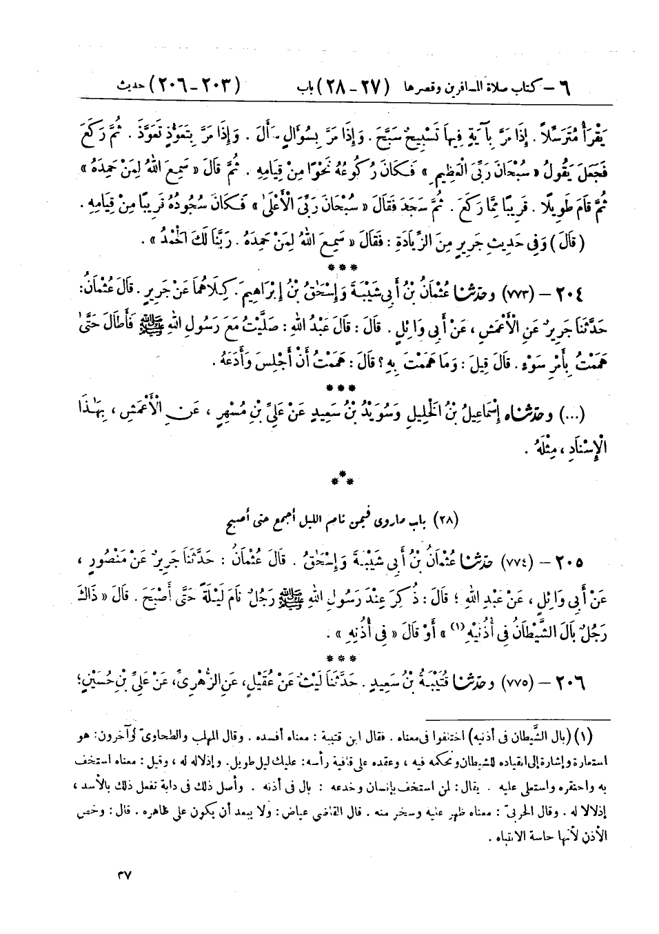 205 - (774) حَدَّثَنَا عُثْمَانُ بْنُ أَبِي شَيْبَةَ، وَإِسْحَاقُ، قَالَ عُثْمَانُ: حَدَّثَنَا جَرِيرٌ، عَنْ مَنْصُورٍ، عَنْ أَبِي وَائِلٍ، عَنْ عَبْدِ اللهِ، قَالَ: ذُكِرَ عِنْدَ رَسُولِ اللهِ صَلَّى اللهُ عَلَيْهِ وَسَلَّمَ §رَجُلٌ نَامَ لَيْلَةً حَتَّى أَصْبَحَ، قَالَ: «ذَاكَ رَجُلٌ بَالَ الشَّيْطَانُ فِي أُذُنَيْهِ»، أَوْ قَالَ: «فِي أُذُنِهِ»