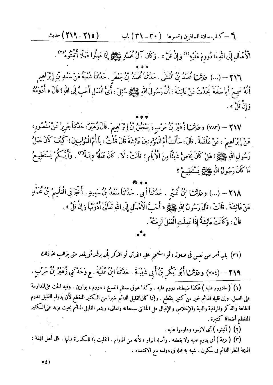 218 - (783) وحَدَّثَنَا ابْنُ نُمَيْرٍ، حَدَّثَنَا أَبِي، حَدَّثَنَا سَعْدُ بْنُ سَعِيدٍ، أَخْبَرَنِي الْقَاسِمُ بْنُ مُحَمَّدٍ، عَنْ عَائِشَةَ، قَالَتْ: قَالَ رَسُولُ اللهِ صَلَّى اللهُ عَلَيْهِ وَسَلَّمَ: «§أَحَبُّ الْأَعْمَالِ إِلَى اللهِ تَعَالَى أَدْوَمُهَا، وَإِنْ قَلَّ»، قَالَ: وَكَانَتْ عَائِشَةُ إِذَا عَمِلَتِ الْعَمَلَ لَزِمَتْهُ