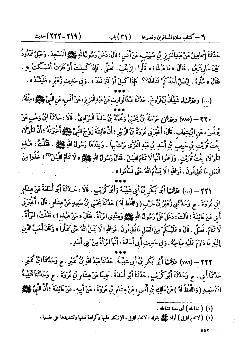 222 - (786) حَدَّثَنَا أَبُو بَكْرِ بْنُ أَبِي شَيْبَةَ، حَدَّثَنَا عَبْدُ اللهِ بْنُ نُمَيْرٍ، ح وحَدَّثَنَا ابْنُ نُمَيْرٍ، حَدَّثَنَا أَبِي، ح وحَدَّثَنَا أَبُو كُرَيْبٍ، حَدَّثَنَا أَبُو أُسَامَةَ، جَمِيعًا عَنْ هِشَامِ بْنِ عُرْوَةَ، ح وحَدَّثَنَا قُتَيْبَةُ بْنُ سَعِيدٍ، وَاللَّفْظُ لَهُ، عَنْ مَالِكِ بْنِ أَنَسٍ، عَنْ هِشَامِ بْنِ عُرْوَةَ، عَنْ أَبِيهِ، عَنْ عَائِشَةَ، أَنَّ النَّبِيَّ صَلَّى اللهُ عَلَيْهِ وَسَلَّمَ، قَالَ: «§إِذَا نَعَسَ أَحَدُكُمْ فِي الصَّلَاةِ فَلْيَرْقُدْ حَتَّى يَذْهَبَ عَنْهُ النَّوْمُ، فَإِنَّ أَحَدَكُمْ إِذَا صَلَّى وَهُوَ نَاعِسٌ لَعَلَّهُ يَذْهَبُ يَسْتَغْفِرُ، فَيَسُبُّ نَفْسَهُ»