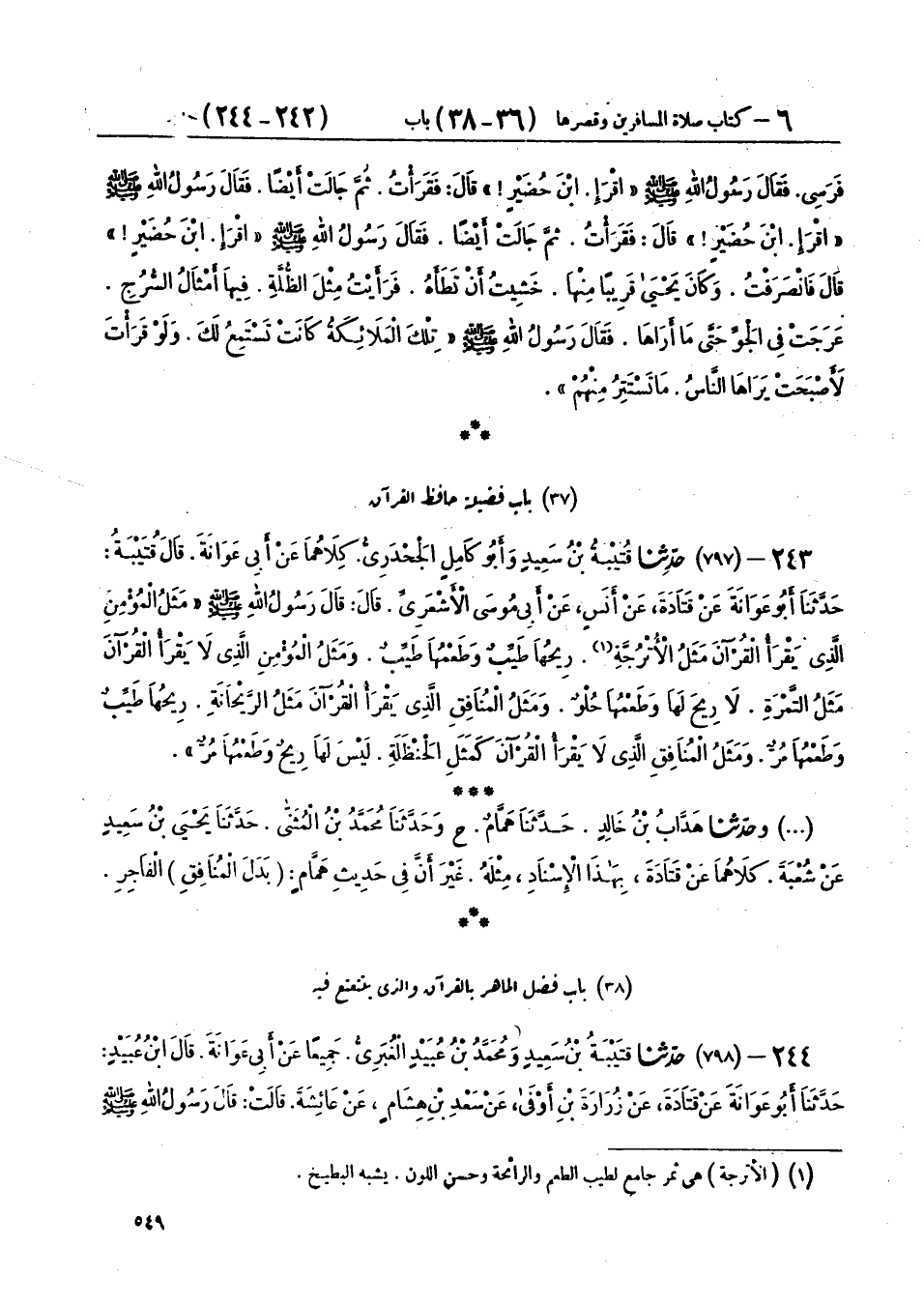 243 - (797) حَدَّثَنَا قُتَيْبَةُ بْنُ سَعِيدٍ، وَأَبُو كَامِلٍ الْجَحْدَرِيُّ، كِلَاهُمَا عَنْ أَبِي عَوَانَةَ، قَالَ قُتَيْبَةُ: حَدَّثَنَا أَبُو عَوَانَةَ، عَنْ قَتَادَةَ، عَنْ أَنَسٍ، عَنْ أَبِي مُوسَى الْأَشْعَرِيِّ، قَالَ: قَالَ رَسُولُ اللهِ صَلَّى اللهُ عَلَيْهِ وَسَلَّمَ: §مَثَلُ الْمُؤْمِنِ الَّذِي يَقْرَأُ الْقُرْآنَ، مَثَلُ الْأُتْرُجَّةِ، رِيحُهَا طَيِّبٌ وَطَعْمُهَا طَيِّبٌ، وَمَثَلُ الْمُؤْمِنِ الَّذِي لَا يَقْرَأُ الْقُرْآنَ مَثَلُ التَّمْرَةِ، لَا رِيحَ لَهَا وَطَعْمُهَا حُلْوٌ، وَمَثَلُ الْمُنَافِقِ الَّذِي يَقْرَأُ الْقُرْآنَ، مَثَلُ الرَّيْحَانَةِ، رِيحُهَا طَيِّبٌ وَطَعْمُهَا مُرٌّ، وَمَثَلُ الْمُنَافِقِ الَّذِي لَا يَقْرَأُ الْقُرْآنَ، كَمَثَلِ الْحَنْظَلَةِ، لَيْسَ لَهَا رِيحٌ وَطَعْمُهَا مُرٌّ ".