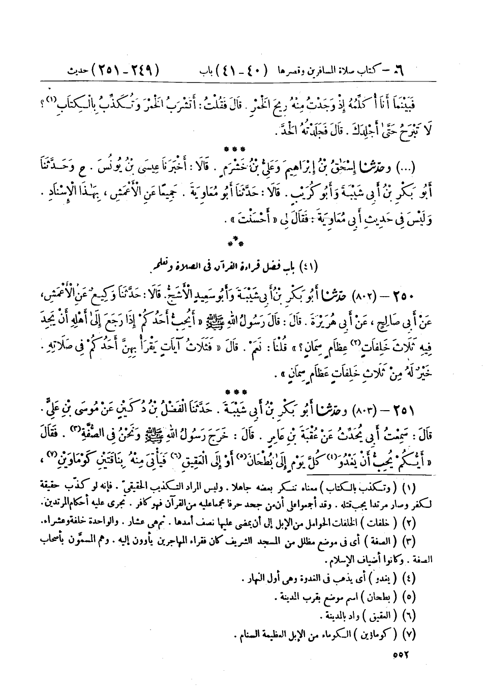 251 - (803) وحَدَّثَنَا أَبُو بَكْرِ بْنُ أَبِي شَيْبَةَ، حَدَّثَنَا الْفَضْلُ بْنُ دُكَيْنٍ، عَنْ مُوسَى بْنِ عُلَيٍّ، قَالَ: سَمِعْتُ أَبِي، يُحَدِّثُ عَنْ عُقْبَةَ بْنِ عَامِرٍ، قَالَ: خَرَجَ رَسُولُ اللهِ صَلَّى اللهُ عَلَيْهِ وَسَلَّمَ وَنَحْنُ فِي الصُّفَّةِ، فَقَالَ: «أَيُّكُمْ يُحِبُّ أَنْ يَغْدُوَ كُلَّ يَوْمٍ إِلَى بُطْحَانَ، أَوْ إِلَى الْعَقِيقِ، فَيَأْتِيَ مِنْهُ بِنَاقَتَيْنِ كَوْمَاوَيْنِ فِي غَيْرِ إِثْمٍ، وَلَا قَطْعِ رَحِمٍ؟»، فَقُلْنَا: يَا رَسُولَ اللهِ نُحِبُّ ذَلِكَ، قَالَ: «§أَفَلَا يَغْدُو أَحَدُكُمْ إِلَى الْمَسْجِدِ فَيَعْلَمُ، أَوْ يَقْرَأُ آيَتَيْنِ مِنْ كِتَابِ اللهِ عَزَّ وَجَلَّ، خَيْرٌ لَهُ مِنْ نَاقَتَيْنِ، وَثَلَاثٌ خَيْرٌ لَهُ مِنْ ثَلَاثٍ، وَأَرْبَعٌ خَيْرٌ لَهُ مِنْ أَرْبَعٍ، وَمِنْ أَعْدَادِهِنَّ مِنَ الْإِبِلِ»