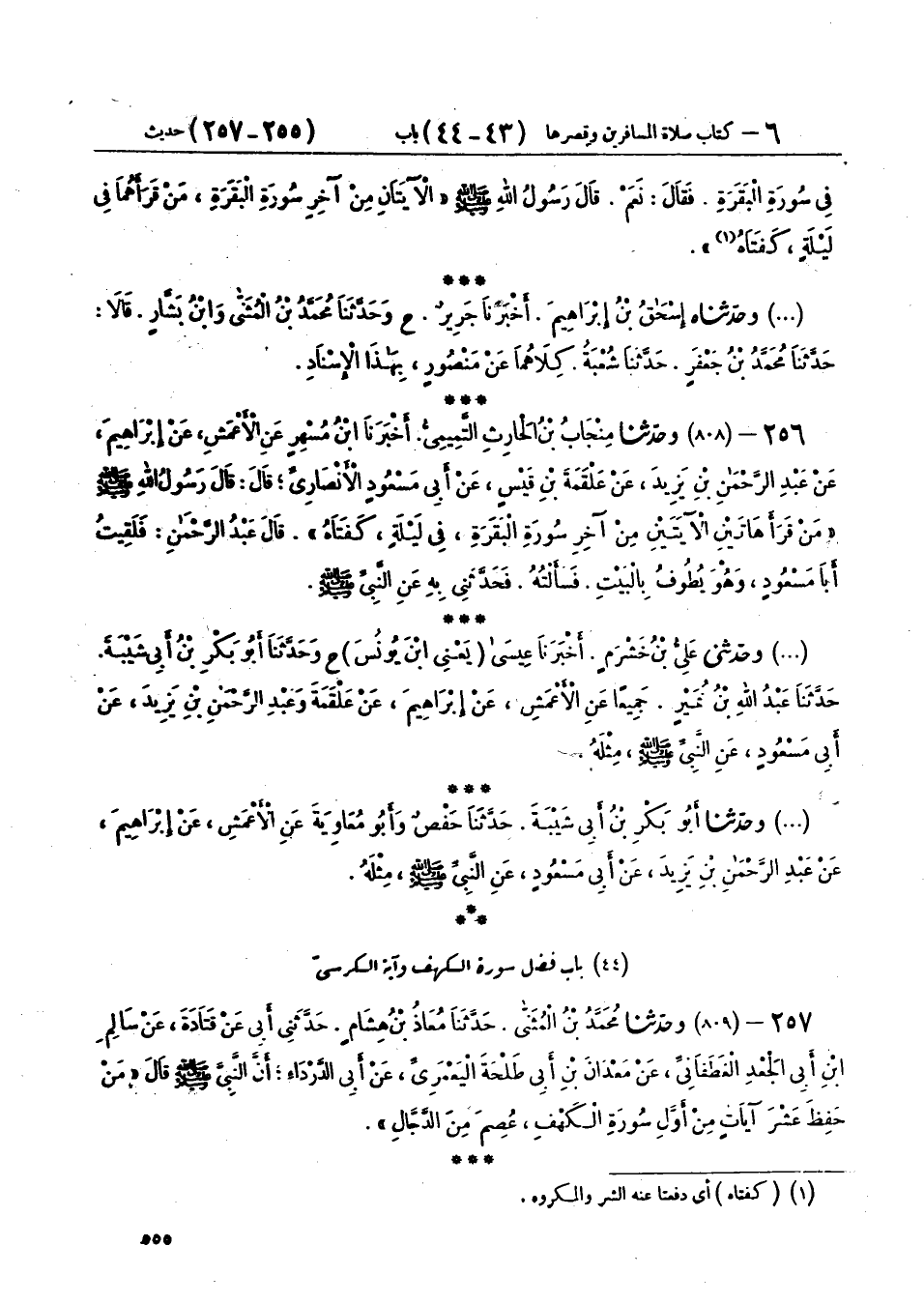 256 - (808) وحَدَّثَنَا مِنْجَابُ بْنُ الْحَارِثِ التَّمِيمِيُّ، أَخْبَرَنَا ابْنُ مُسْهِرٍ، عَنِ الْأَعْمَشِ، عَنْ إِبْرَاهِيمَ، عَنْ عَبْدِ الرَّحْمَنِ بْنِ يَزِيدَ، عَنْ عَلْقَمَةَ بْنِ قَيْسٍ، عَنْ أَبِي مَسْعُودٍ الْأَنْصَارِيِّ، قَالَ: قَالَ رَسُولُ اللهِ صَلَّى اللهُ عَلَيْهِ وَسَلَّمَ: «§مَنْ قَرَأَ هَاتَيْنِ الْآيَتَيْنِ مِنْ آخِرِ سُورَةِ الْبَقَرَةِ فِي لَيْلَةٍ كَفَتَاهُ». قَالَ عَبْدُ الرَّحْمَنِ: فَلَقِيتُ أَبَا مَسْعُودٍ وَهُوَ يَطُوفُ بِالْبَيْتِ فَسَأَلْتُهُ، فَحَدَّثَنِي بِهِ عَنِ النَّبِيِّ صَلَّى اللهُ عَلَيْهِ وَسَلَّمَ.
